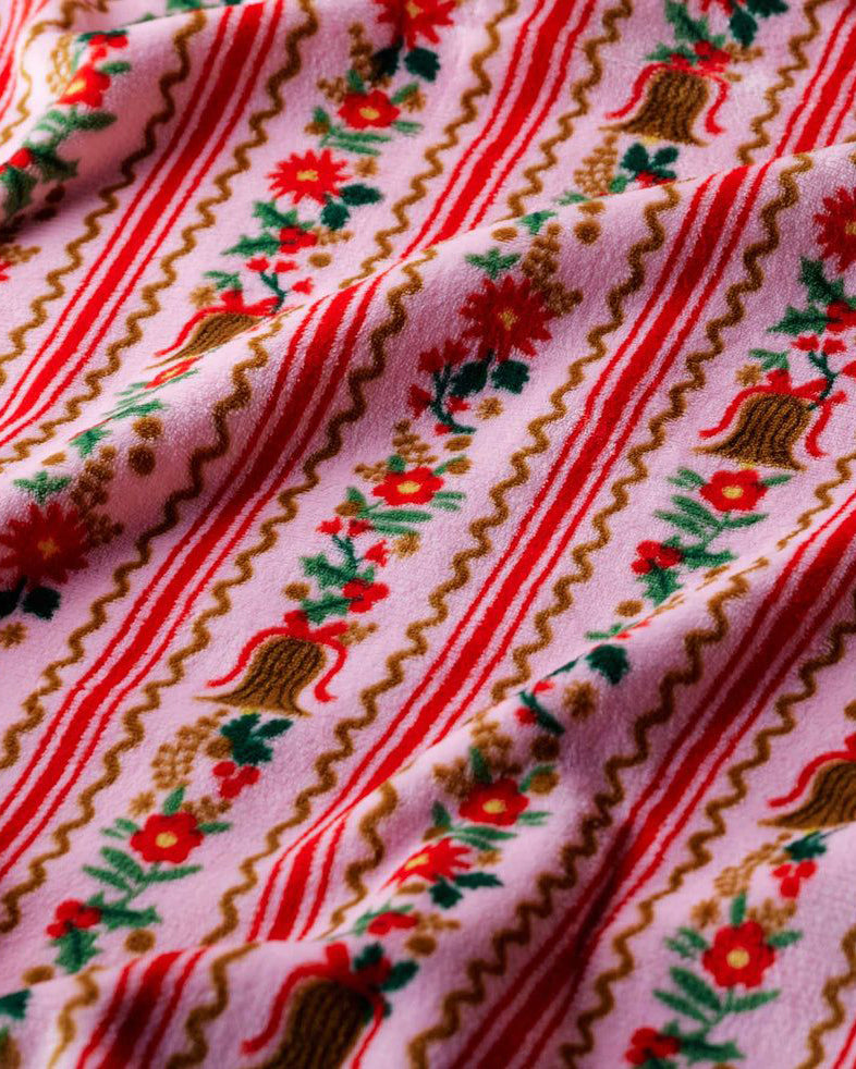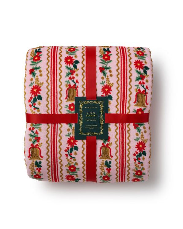 curl up on chilly nights with this cozy blanket, featuring the blooms and bells of rifle paper co's holly jolly print. made of plush fleece, blanket comes packaged with a ribbon so it’s ready to gift.