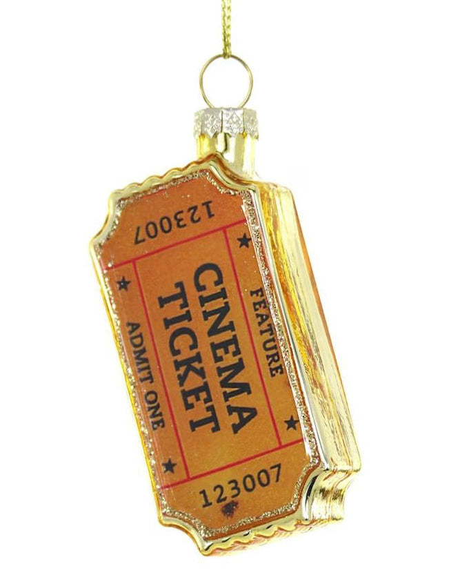 celebrate a love of movies and film with this cinema ticket ornament! ornament has a vintage vibe, a golden hue, and a glittery border.