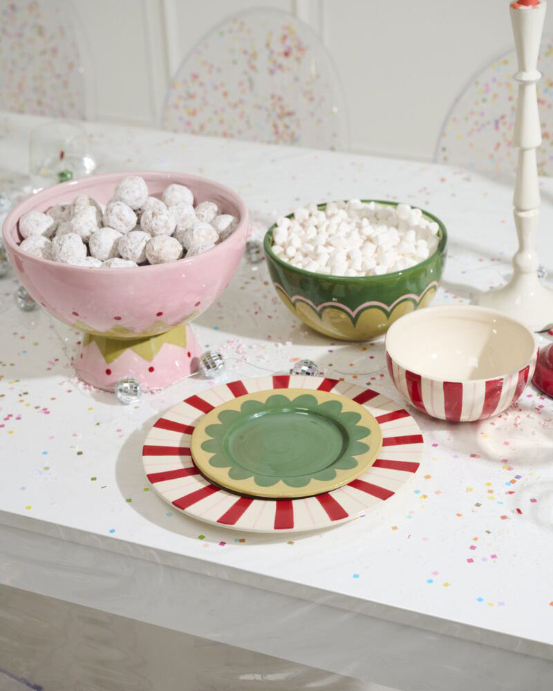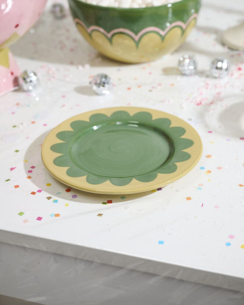 Personify Shopholiday treats will look irresistible when served on this unique side plate. ceramic plate has a playful, hand-painted scalloped pattern in festive deep green and ochre. pair with other pieces of deck the halls dishes for a cheery table this holiday season.
