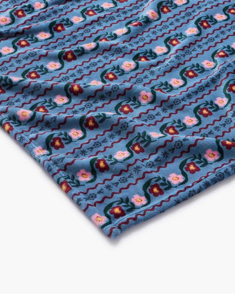 curl up on chilly nights with this cozy blanket, featuring rifle paper co's delphine florals in charming illustrated stripes. made of plush fleece, blanket comes packaged with a ribbon so it’s ready to gift.