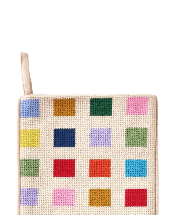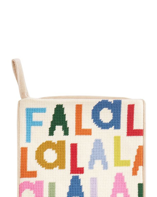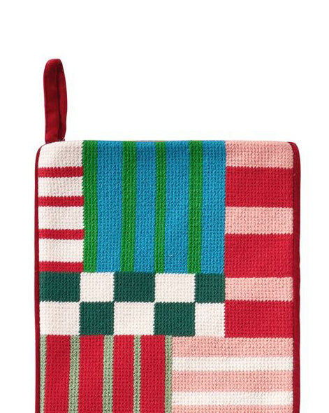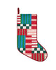 Personify Shopcolorful christmas stocking with an embroidered needlepoint design. front of stocking has a modern vibe, while back of stocking has a luxe, velvety feel. stocking is available in three unique designs.