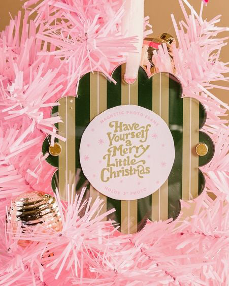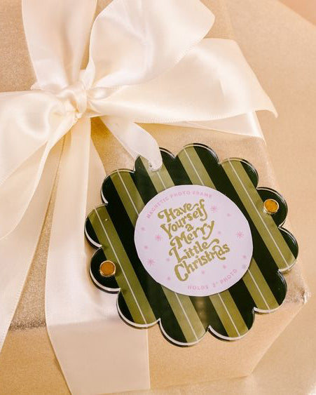 Personify Shopadd a personal touch to your christmas tree with this festive frame ornament. acrylic ornament has a sleek, playful look and features a two-tone green striped design, a scalloped border, and an ivory ribbon for hanging. ornament has magnetic panels, allowing you to easily swap in your favorite round photo. hang it on your tree or attach it to a gift using the included ribbon. ornament is perfect for gifting or collecting!