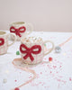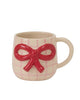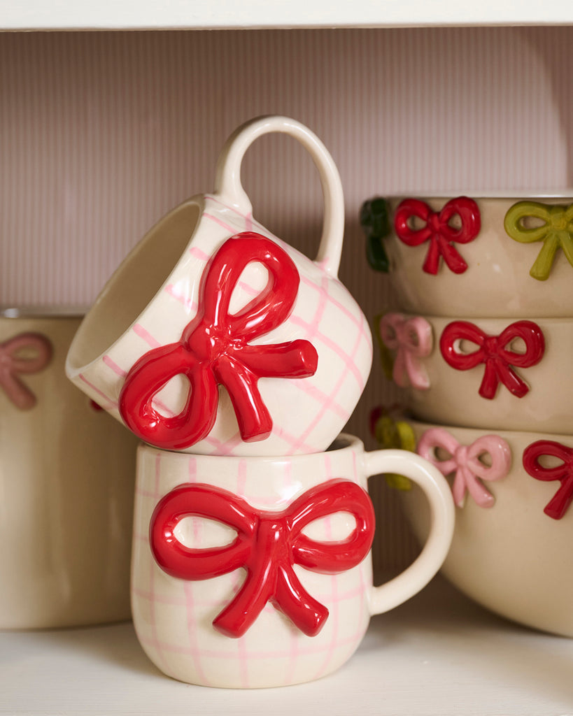 Personify Shopserve a cup of cheer for the holidays in this charming mug. delightful mug features a pink hand-painted grid pattern and a dimensional bright red bow. mug has a smooth, glossy finish. it makes a great gift!