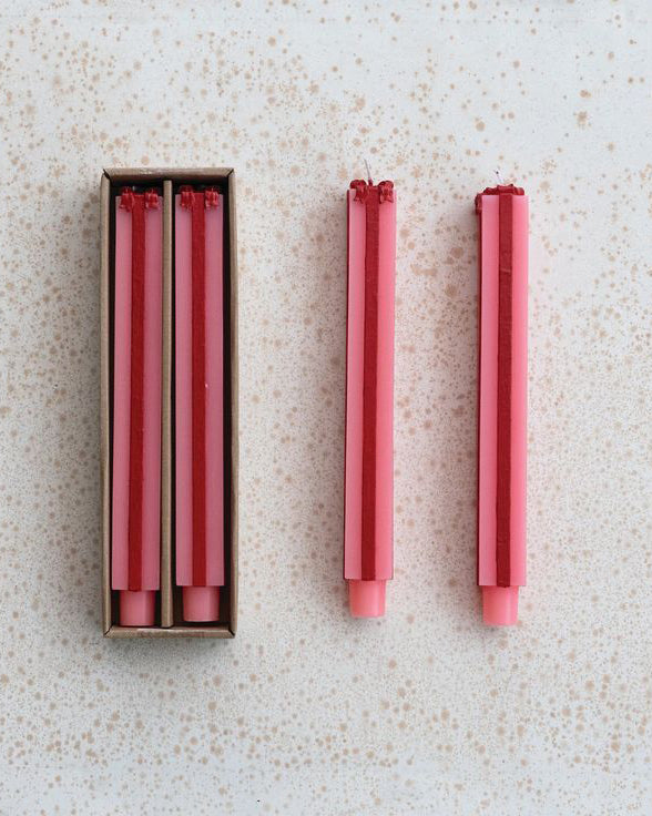 Personify Shopadd some colorful charm to your holiday table with these pink and red taper candles. candles have a present-inspired design and feature a square shape, charming red bow on top, and striped sides.