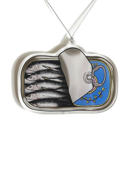 celebrate your love of tinned fish with this unique christmas ornament. double-sided acrylic ornament features a colorful open tin of sardines. ornament includes a sparkly silver loop for easy hanging. it makes a great gift for any lover of tinned fish!