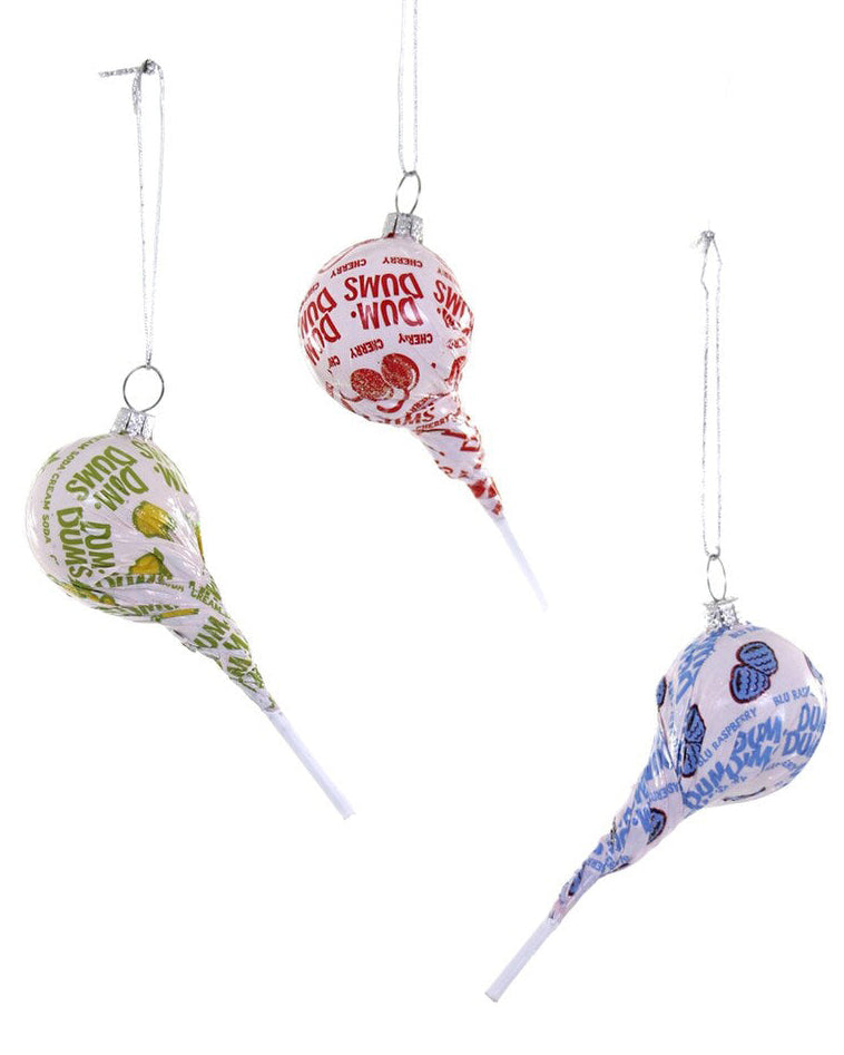 Personify Shopglass ornament in the shape of a dum dum lollipop. ornament has a nostalgic, vintage vibe and is available in three styles. simply choose your favorite flavor to add a touch of fun to your christmas tree.