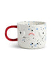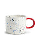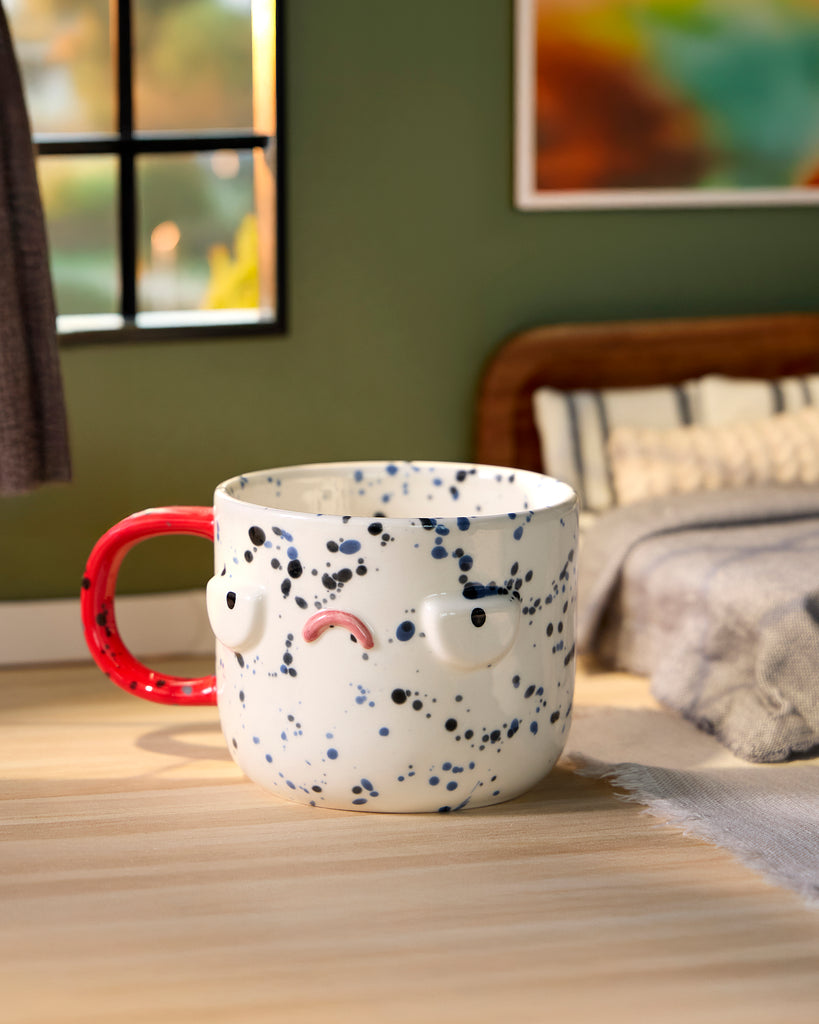 speckled mug with a bold red handle, cheeky frown, and lots of personality. generously sized mug makes a thoughtful gift!