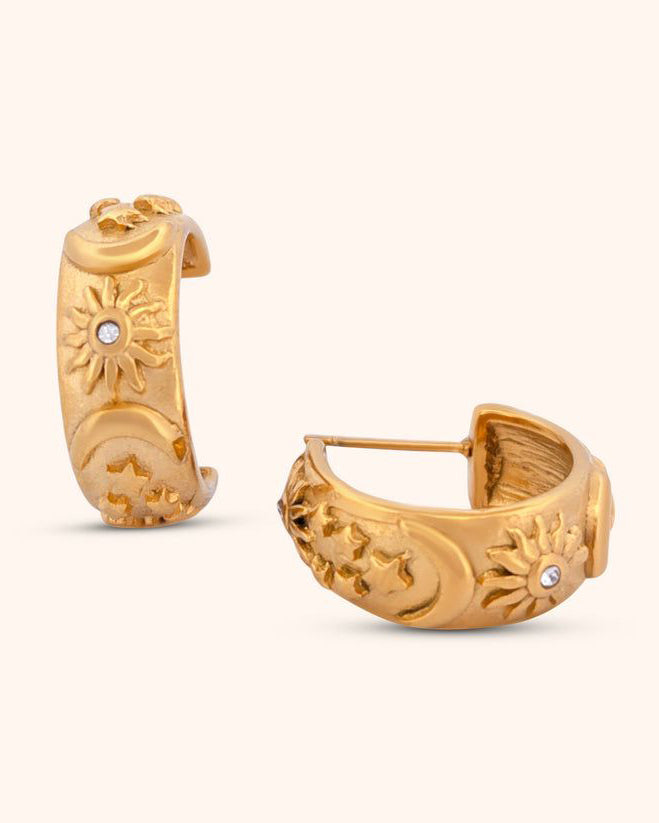Personify Shopbeautifully detailed hoop earrings with a celestial design and crystal details. earrings have a high shine, smooth finish that enhances their elegance. these hoops make a great gift!