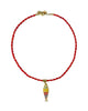 bold red beaded necklace with a colorful fish charm. necklace makes a statement on its own or worn layered with other pieces.