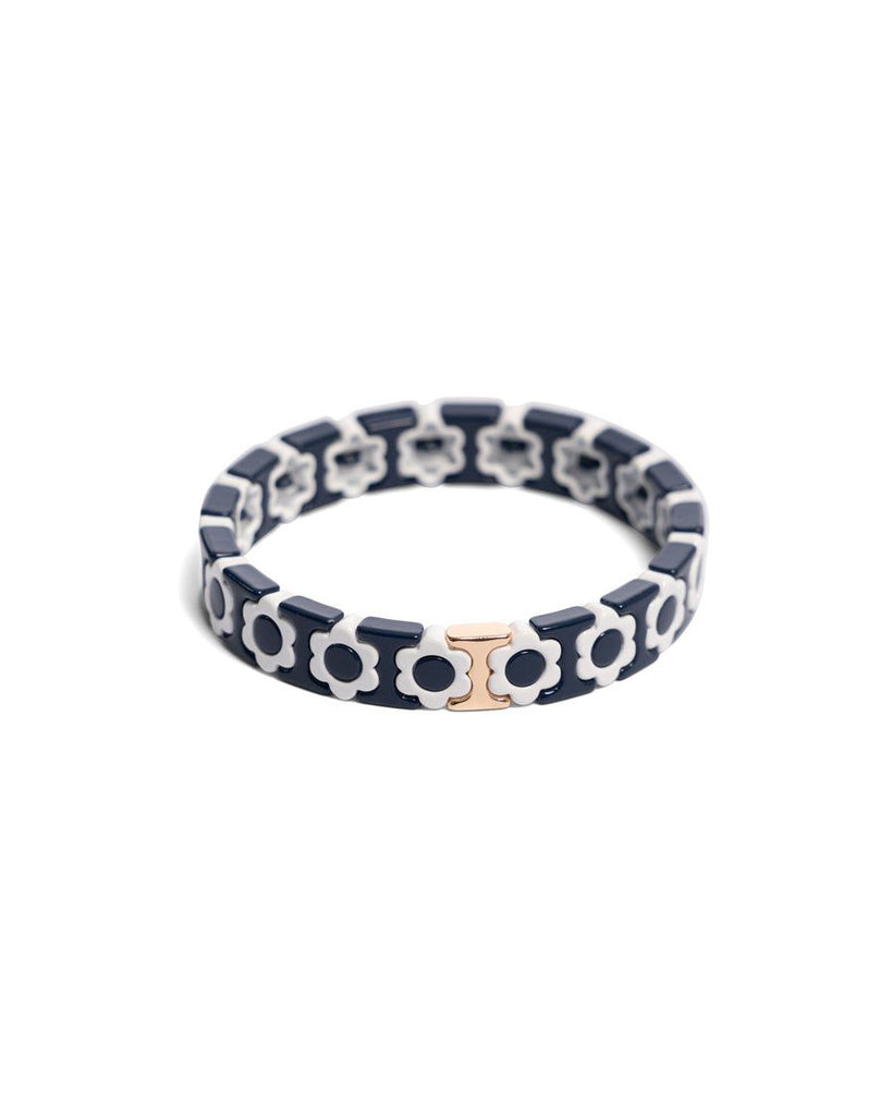 Personify Shopstriking tile bracelet in midnight blue and white with metallic details. stretch bracelet features a white daisy design. it can be worn on its own or styled with other pieces for a unique stack.
