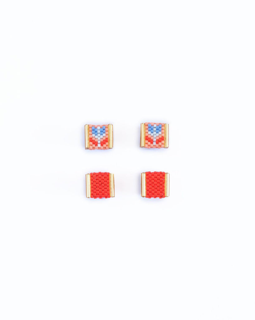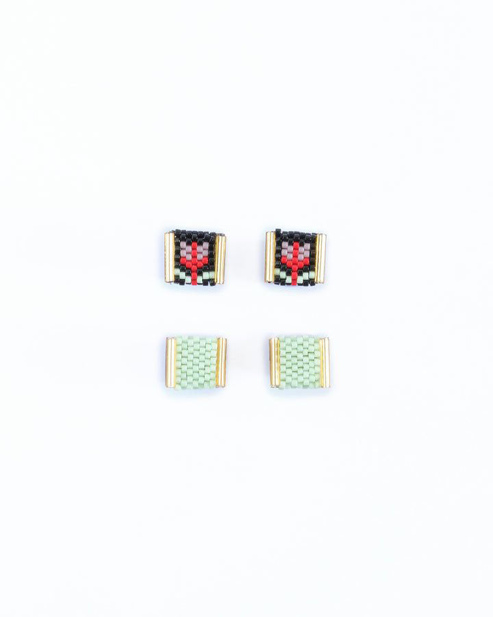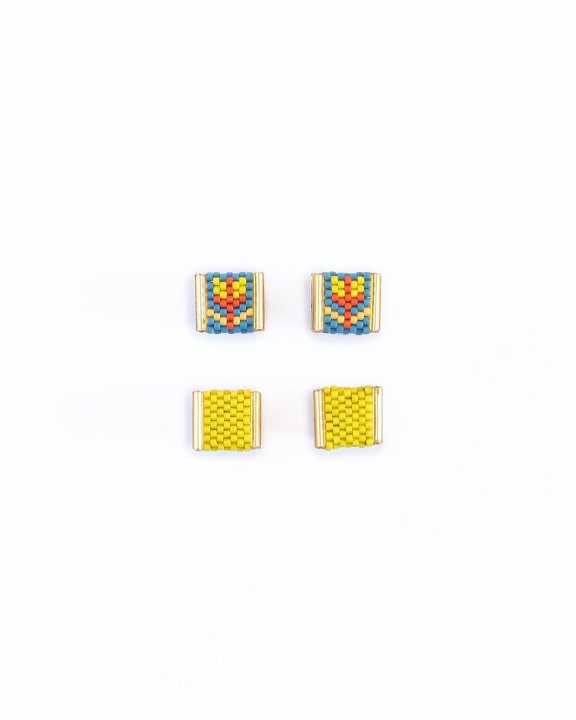 delicate handwoven beaded stud earring pack includes two colorful earrings - one with a tulip design and the other a solid color. earrings are made with premium japanese glass miyuki beads sewn together bead by bead. woven portion securely encloses a stainless steel post. lightweight earrings will add the perfect pop of color to any outfit.