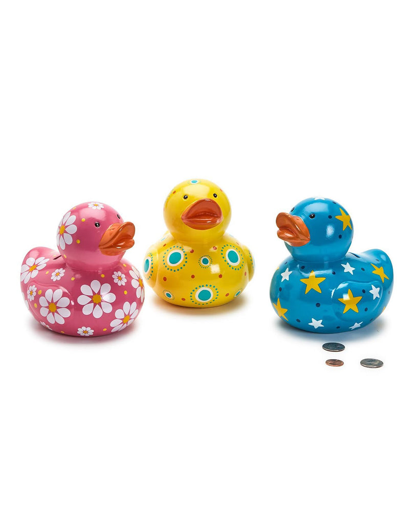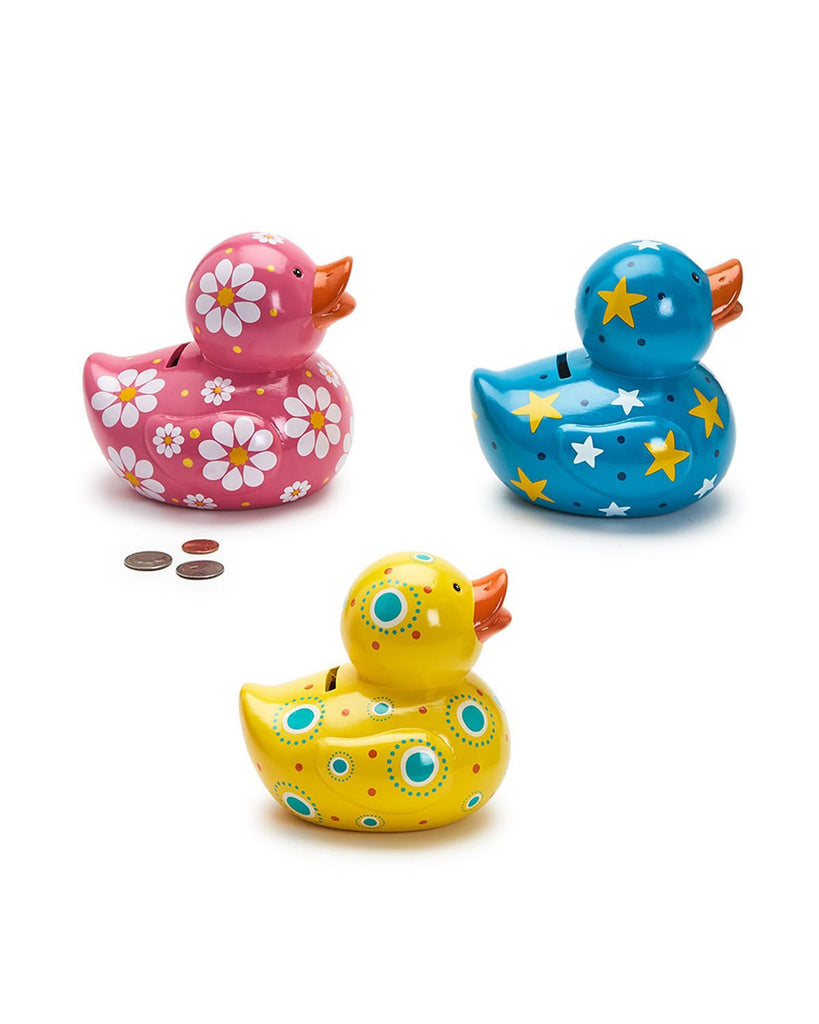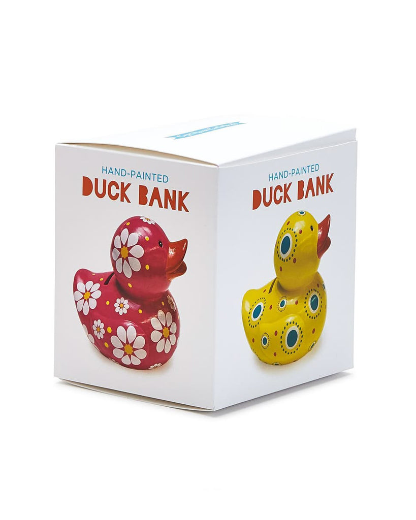 Personify Shopkid's coin bank in the shape of a cute duck. ceramic bank has a rubber ducky-inspired design and features a bold color and unique pattern. it makes a thoughtful gift.