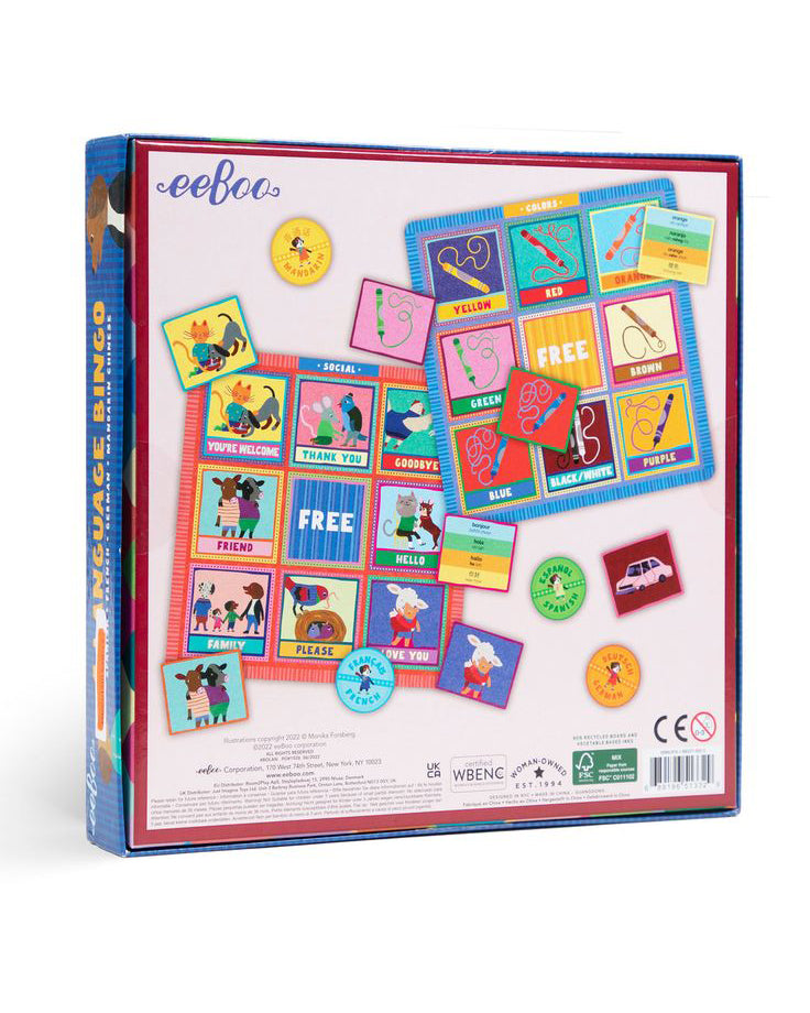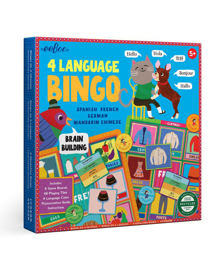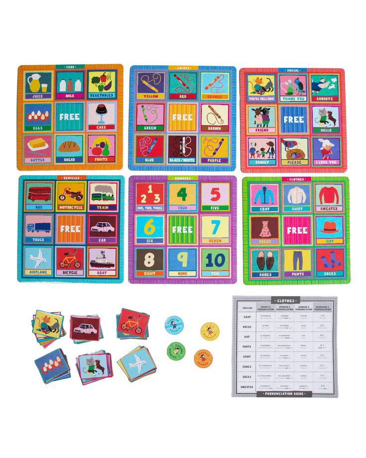 build young brains through excitement and fun with this four language bingo game covering spanish, french, german, and mandarin chinese. bingo set features beautifully illustrated everyday items covering a number of categories - food, clothes, numbers, colors, social terms, and vehicles. original illustrations by monika forsberg. play the game in one language or increase the challenge by switching between the 4 each time you pick an item token. the first to fill their card wins and proves their increasing knowledge!