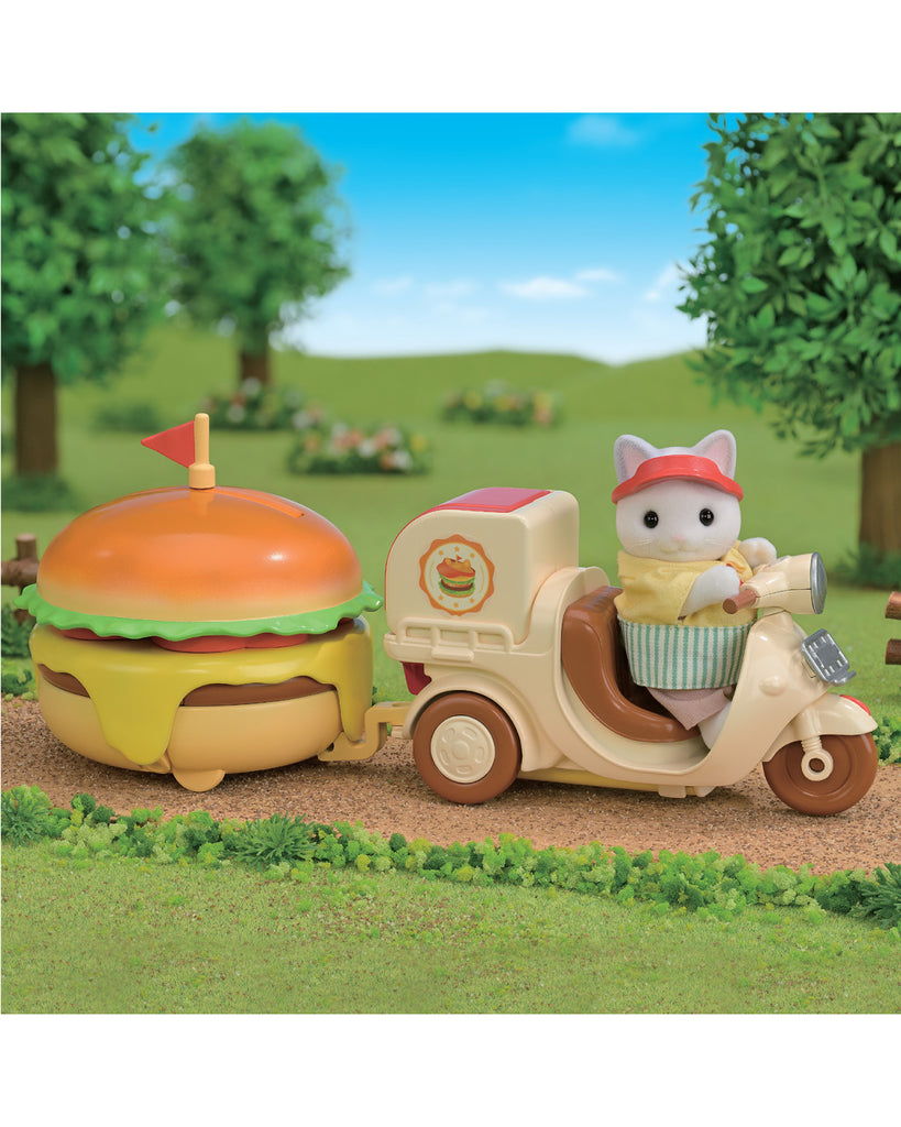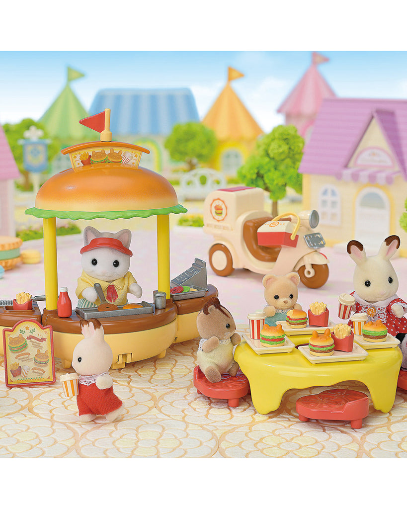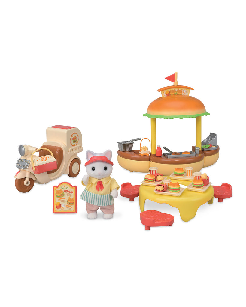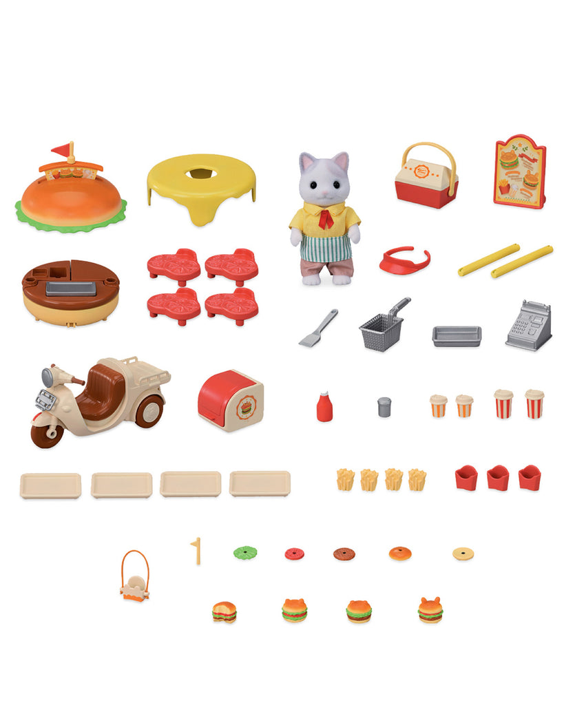 Personify Shopthe hamburger stand set contains a hamburger shop in the shape of a hamburger, plus a delivery bike and the latte cat father. take apart the big hamburger to create various items such as a hamburger stand, table, and chairs. you can have fun grilling patties and frying the hot fries. set comes with over thirty accessories including cute hamburgers with cat ear-shaped buns and drinks. cute set stimulates imaginative role-playing for children.