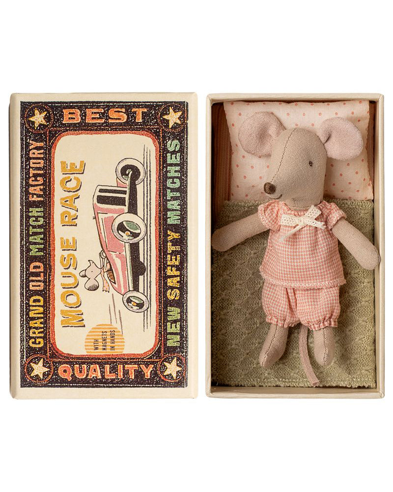 Personify Shopthis classic maileg little sister mouse is ready for hours of play! she sleeps tight in the little matchbox. her clothes and bedlinen are made of soft fabrics with unique prints in beautiful colors. add accessories to keep playtime going!