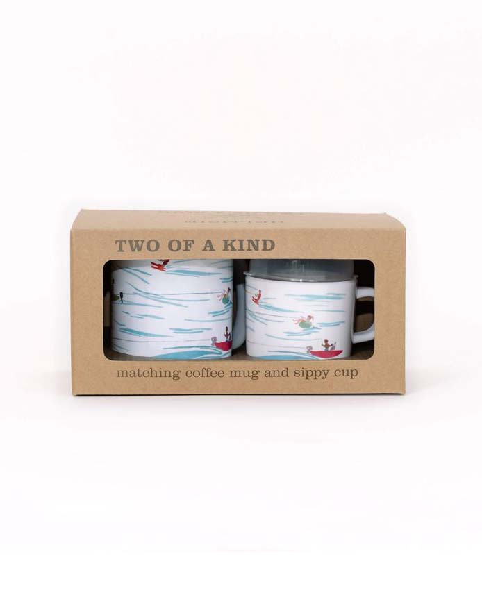 Personify Shopmama and babe will be sweetly matching with this playfully printed mug and sippy cup set. watercolor texture can be seen in the waves and boaters on this gender neutral sippy cup and mug. set makes a wonderful gift!