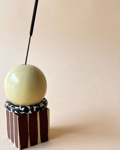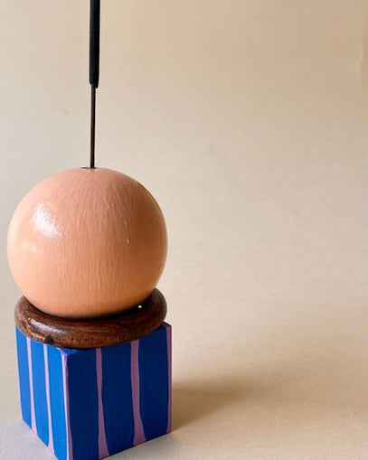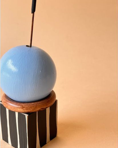 Rkitektthis is a simple, yet bold way to elevate your incense burning experience. wooden incense holder has a painted globe with a striped base.