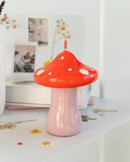 Personify Shoplarge mushroom candle is hand-painted and features a unique and colorful design. decorative candle adds a bit of fun and whimsy to any space and provides a soft ambient light when lit. candles is available in two colors.
