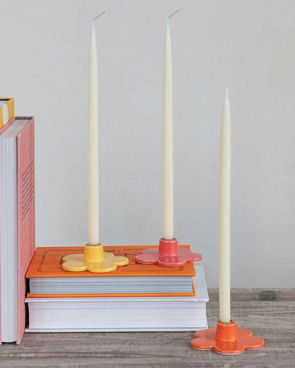 colorful and retro-feeling taper holder in the shape of a flower. stoneware taper holder adds a punchy pop of color to any space.