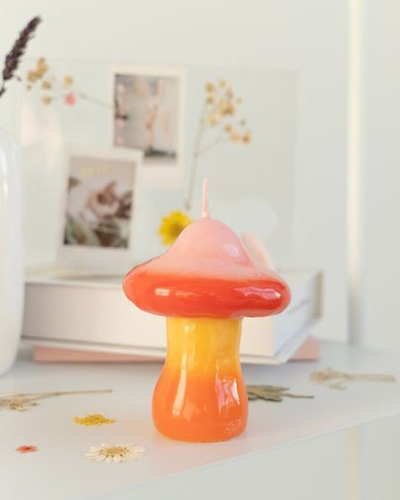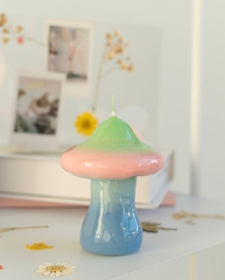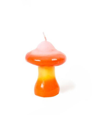 small mushroom candle is hand-painted and features a unique and colorful design. decorative candle adds a bit of fun and whimsy to any space and provides a soft ambient light when lit. candles is available in two colorways.