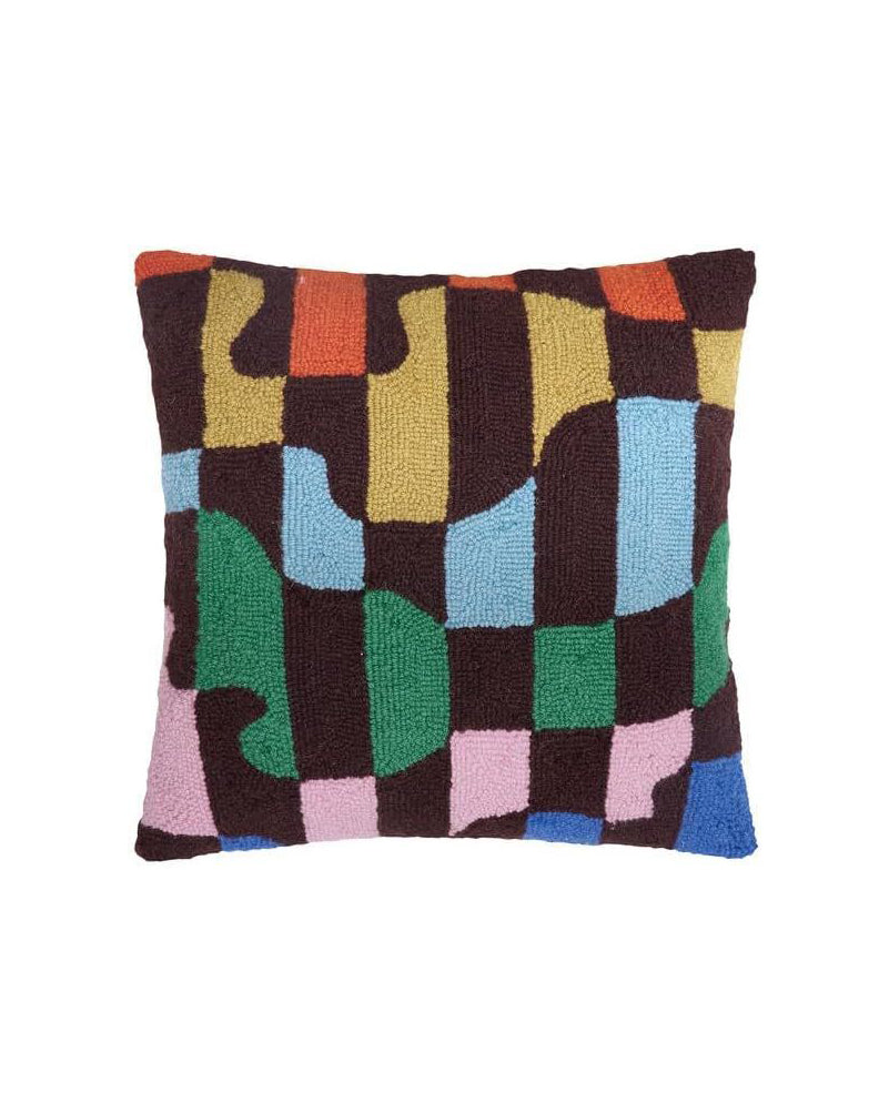 Personify Shopsquare shaped hooked pillow with a colorful abstract stripe design. pillow makes a unique accent for any space.