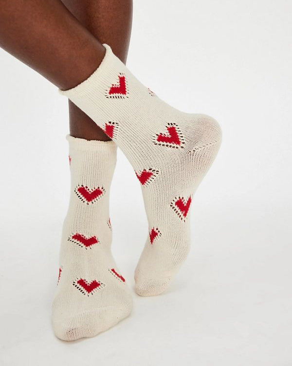 Personify Shopfree people lovely crew socks with a sweet heart pattern. cozy socks feature a ribbed knit fabrication, heart motifs with cut-out accents, and thick, scalloped cuffs. cute socks can be paired with anything from a femme ballet flat to a preppy loafer to a sporty sneaker.