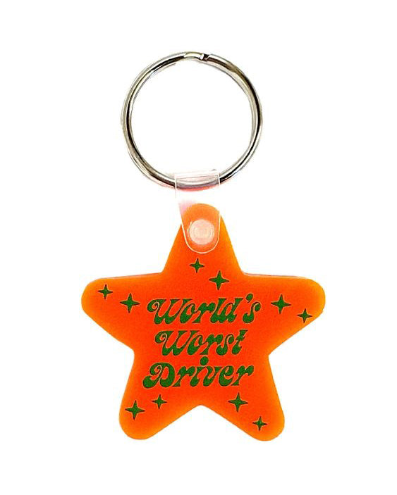 - dimensions (excluding keyring): decided to be difficult and please be nice to me - 2" x 2"; world's worst driver - 1.75" x 3"