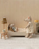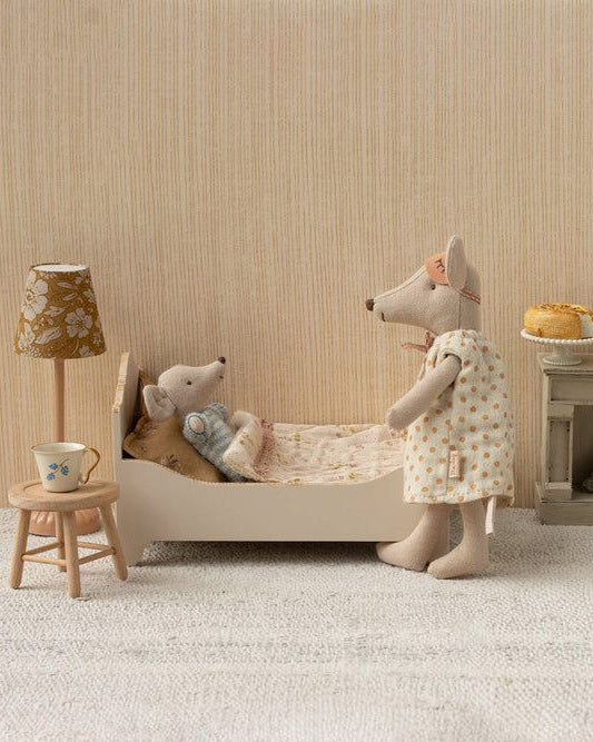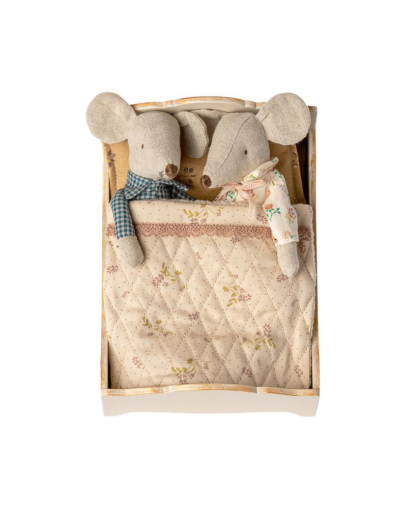 Personify Shopthe perfect bed for a good night's sleep for your maileg mice. bed has beautiful small details, like a golden finish on the wood and beautiful collected fabrics for bedlinens. two mice can easily sleep side by side. bed fits big sister/brother mice.