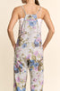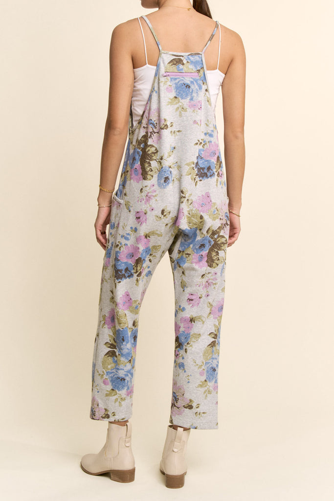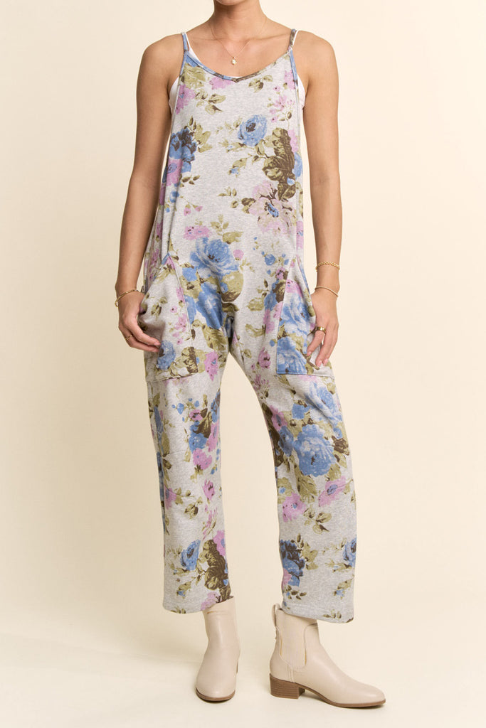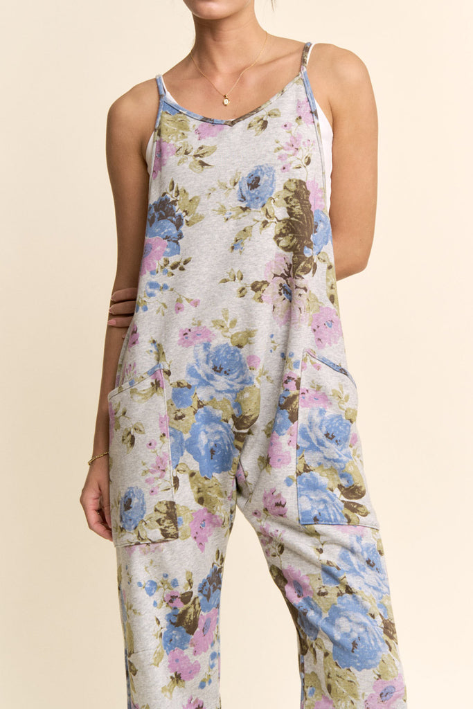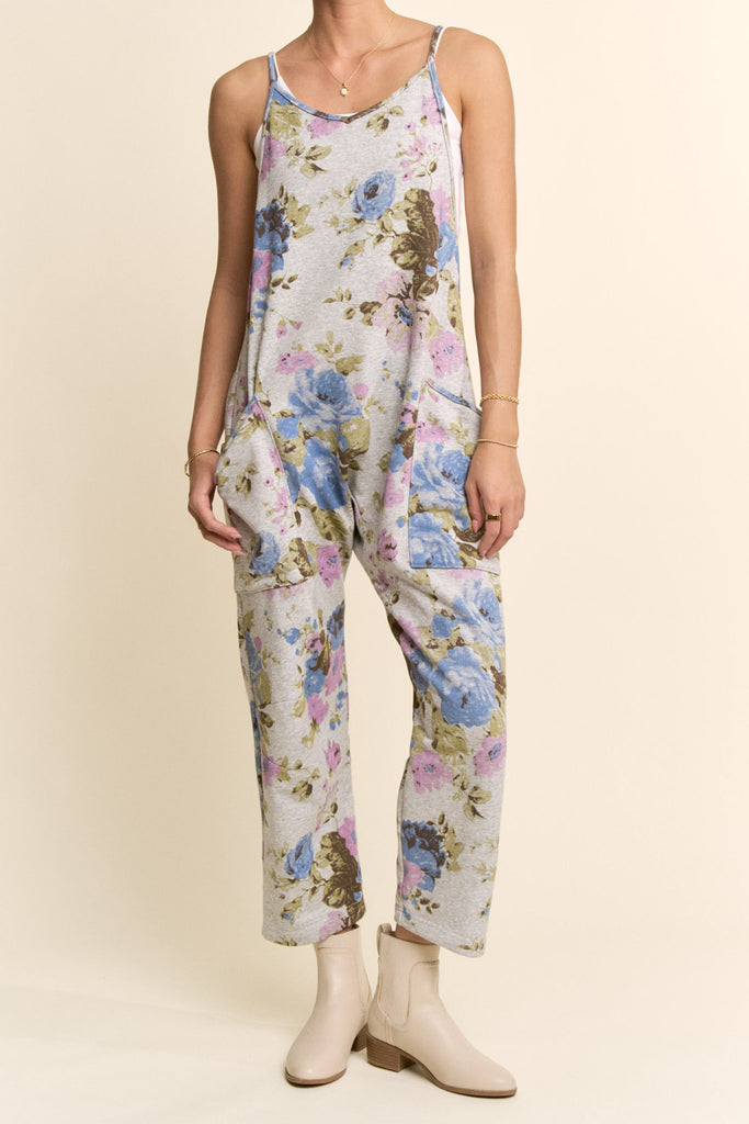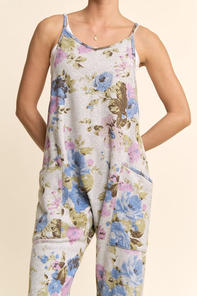 Personify Shopcomfortable heather grey jumpsuit with a pretty light blue and purple-hued floral pattern. jumpsuit is made from a soft jersey material and has free people vibes. it features thin straps, a v neckline, a racerback with zippered pocket, dropped sides, roomy patch pockets, slightly cropped legs, and a loose, relaxed fit. elevated casual jumpsuit is perfect to pair with a fitted long sleeve tee in cooler weather or can be worn with a tank, tee, or bralette for a warm weather look.