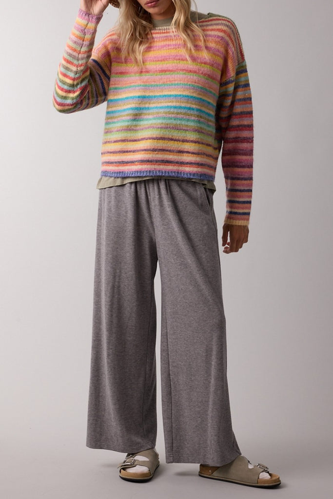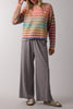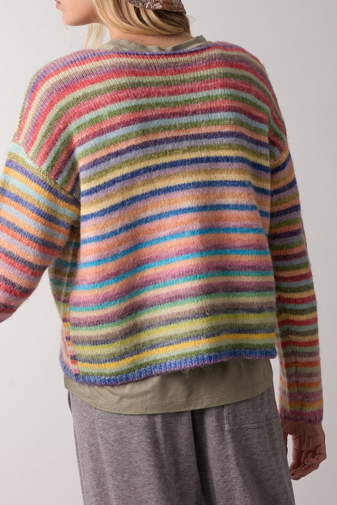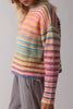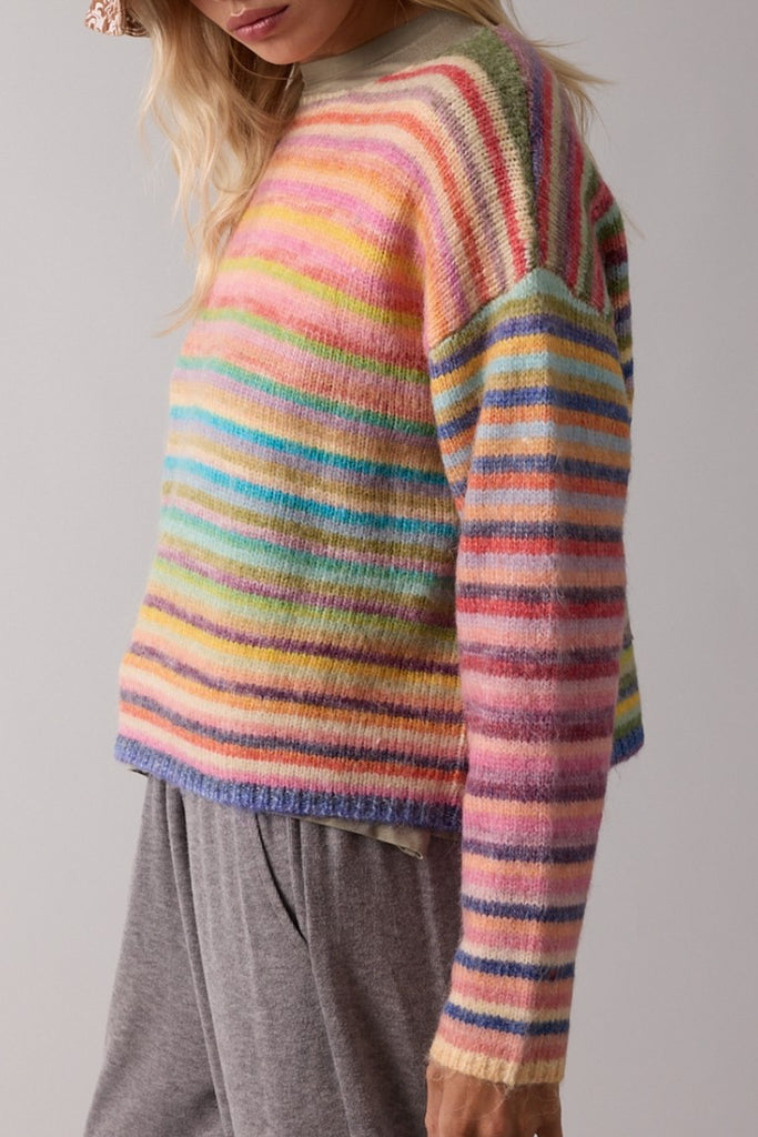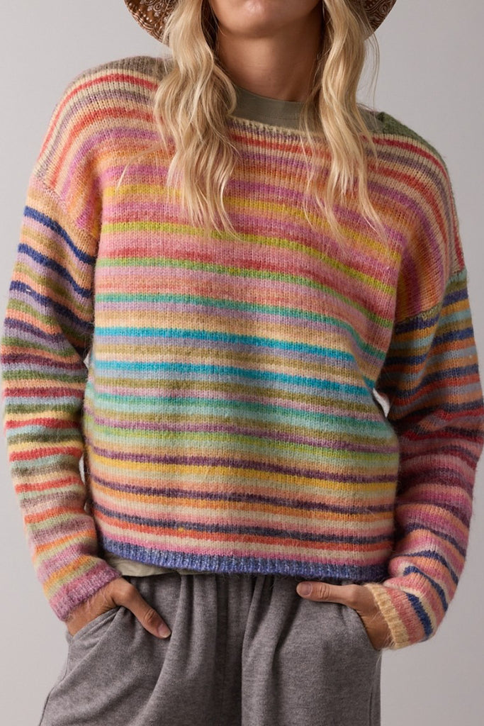 Personify Shopsoft knit sweater with a colorful striped design. special sweater comes in a vibrant array of rainbow-hued colors and has two differently striped sleeves. comfortable sweater features a wide boat neckline, dropped shoulders, roomy long sleeves, and ribbed details on cuffs and bottom hem. fun sweater is perfect to pair with jeans or your favorite bottoms all fall and winter.