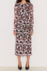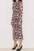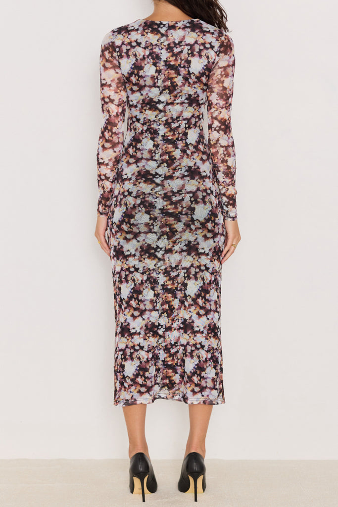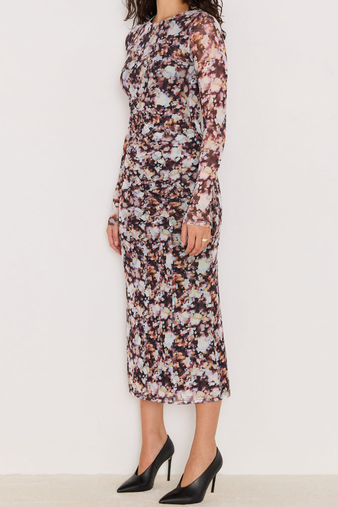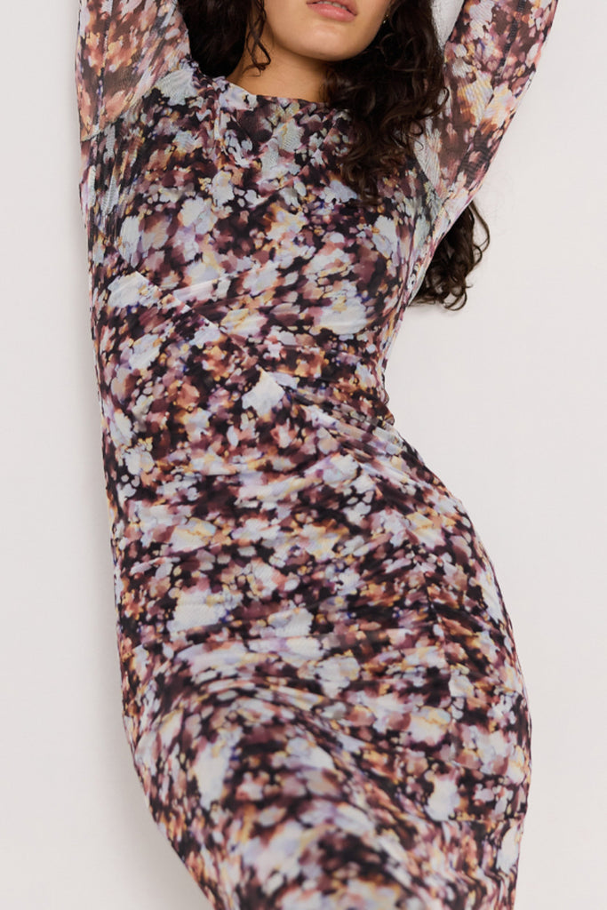 Personify Shopform-fitting midi dress made from a gorgeous floral mesh material. lined dress features a crew neckline, sheer long sleeves, and a ruched seam detail spanning from the waist to the bottom hem, giving dress a great, flattering fit. dress is perfect for any holiday gathering, but can also be worn into the spring and again in the fall.