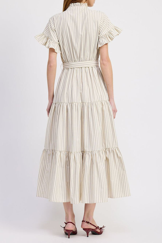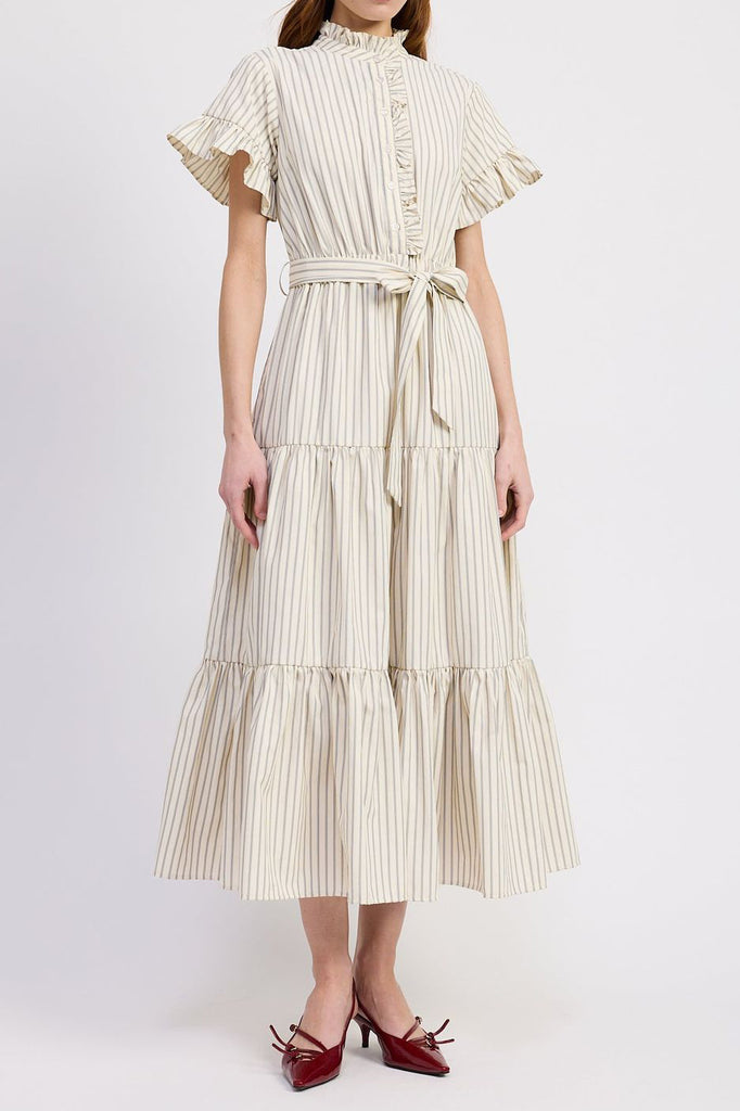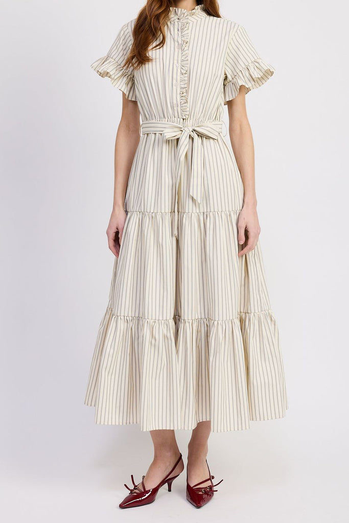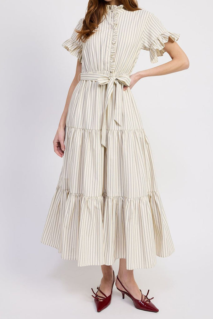 elegant maxi dress in ivory with thin navy blue stripes. lined dress buttons to the waist with a ruffle placket. dress features a high ruffled neckline, short sleeves with ruffles, adjustable belt tie at waist, and a tiered skirt. dress can be styled up or down for a variety of looks.