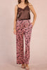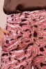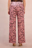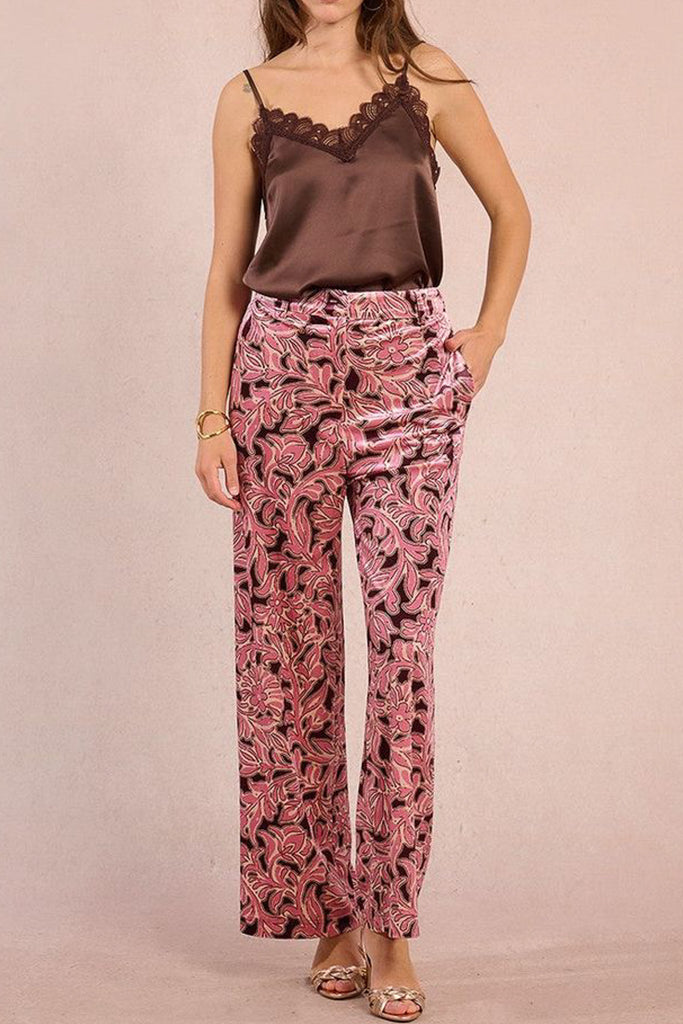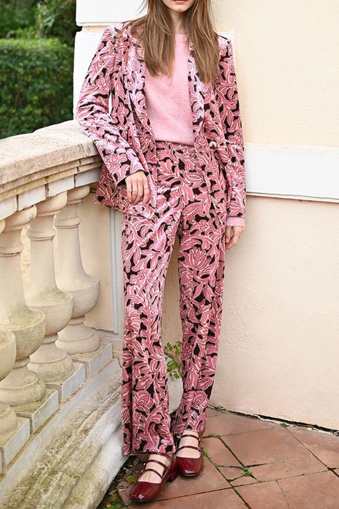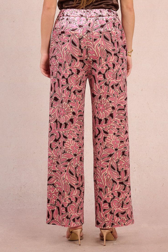 Personify Shopvelvety trousers with a pretty floral design in deep burgundy and two tone pink. special pants feature a high rise waistband with stretchy elastic on back, a zip fly and hook closure, side pockets, and a straight leg silhouette. pants are a comfortable statement piece to pair with a blouse or sweater this holiday season.