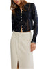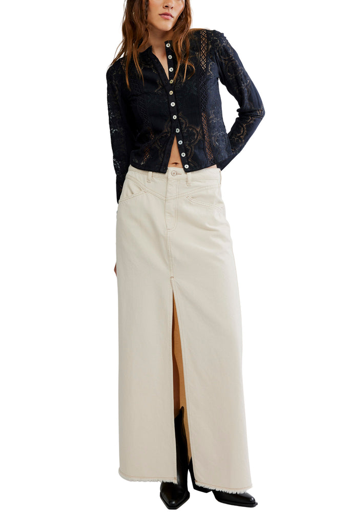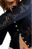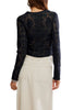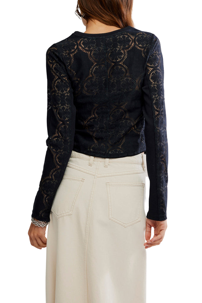 free people dainty sheer lace top in classic black. unlined top features a crew neckline, button front, fitted long sleeves, and sweet picot trim throughout. versatile piece is perfect for layering. note: top runs true to size and is not oversized like many free people pieces.