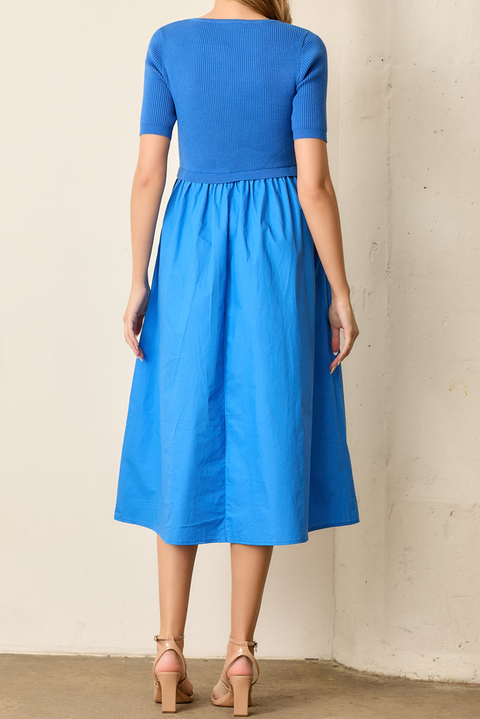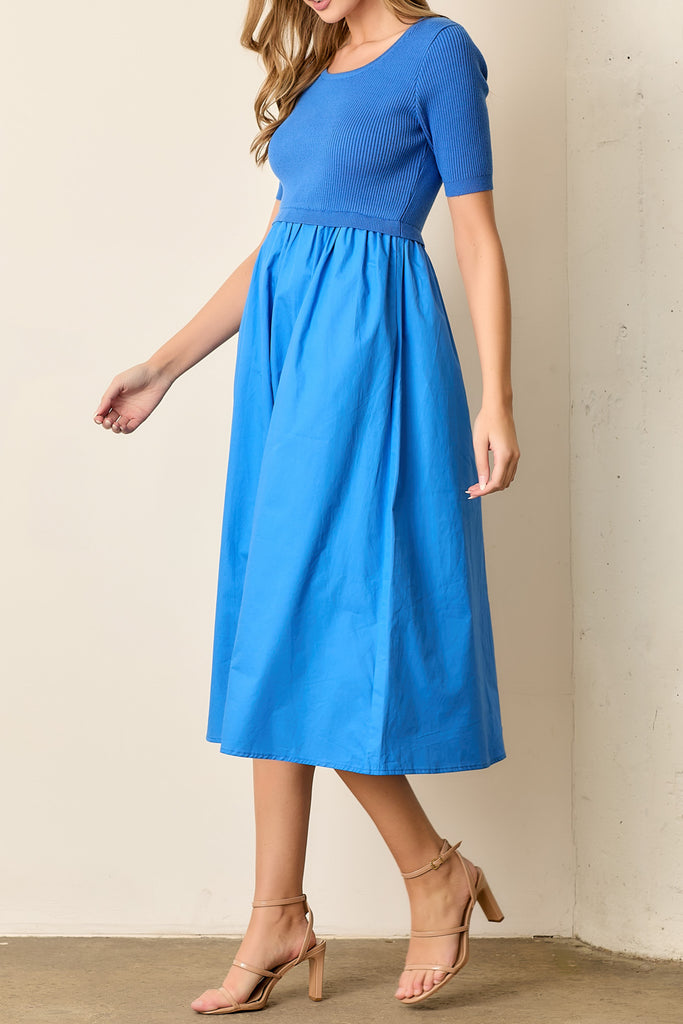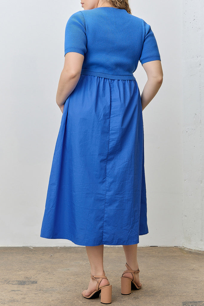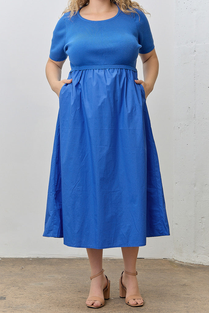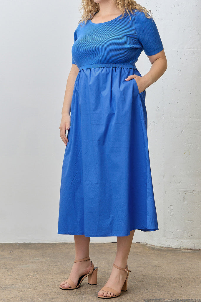 Personify Shopeasy to wear mixed media dress in a bold saturated blue, which is a trendy color for fall. dress features a stretchy ribbed knit bodice with a scoop neckline and short sleeves, while the skirt is made from a crisp poplin-like material and features side pockets and a full silhouette. dress runs true to size and is available in an inclusive size range.
