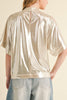 Personify Shopunique top made from a shimmery and glossy champagne colored material. lightweight top features a mock neckline, keyhole button closure on back, roomy half sleeves, a notched hemline, and a loose fit. top can be styled casually with jeans or dressed up with black pants for an easy and festive holiday look.