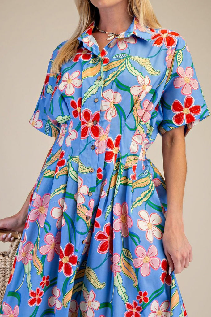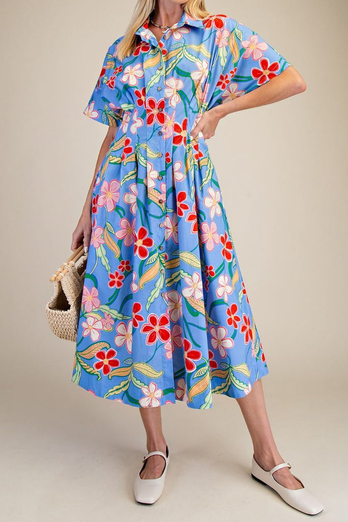 Personify Shopretro-feeling midi dress in a colorful sky blue floral pattern. generously sized dress features a petite collar, button front, stretchy smocked waistband on back, unique short sleeves, pleated details on waist, and a full midi-length skirt. dress has a fun, springy vibe that is perfect for easter and other festivities.