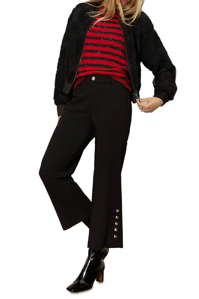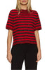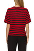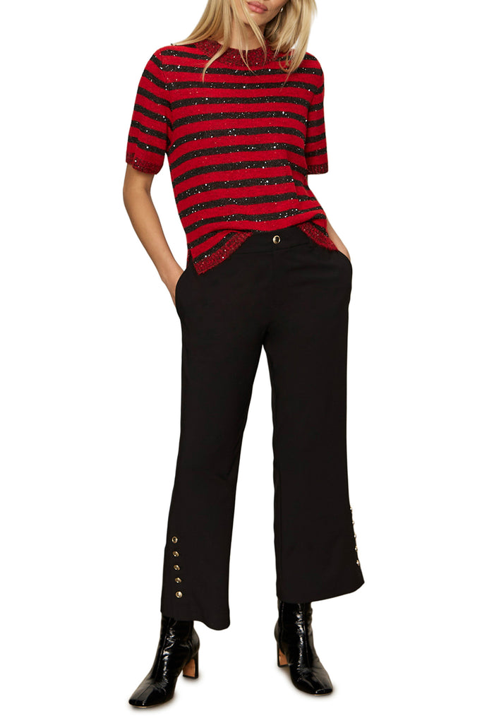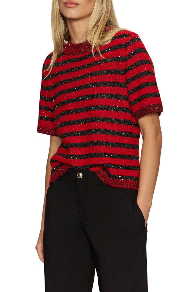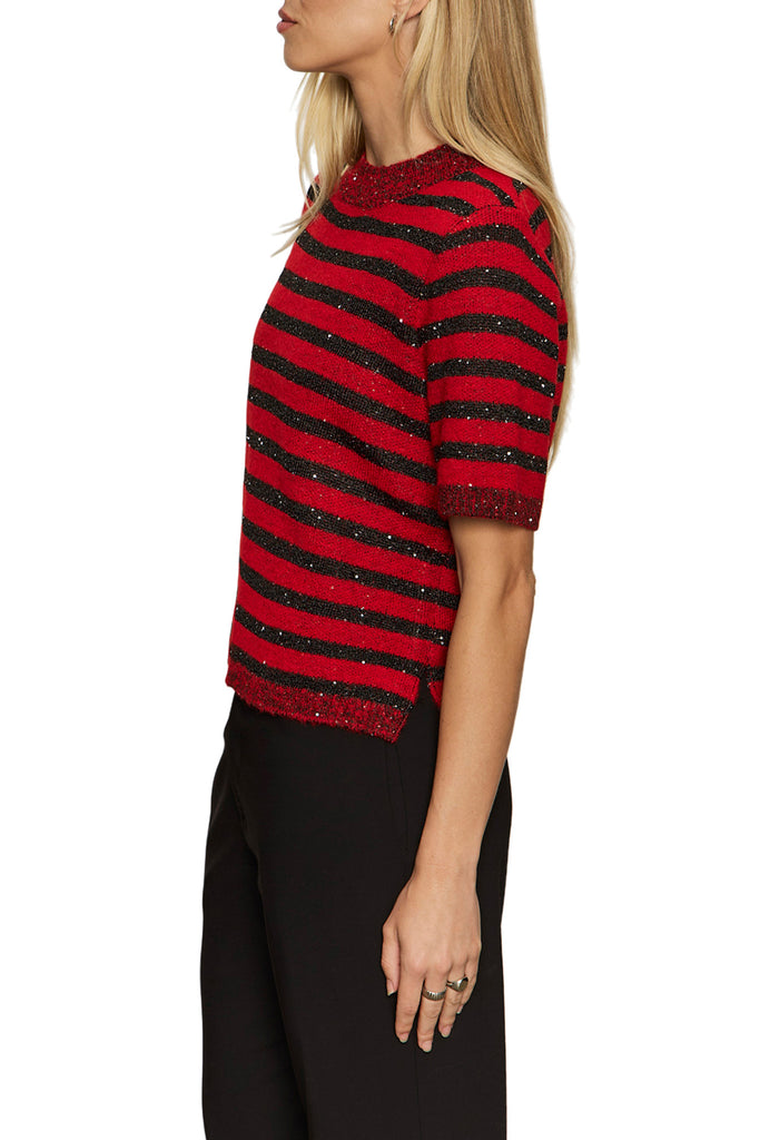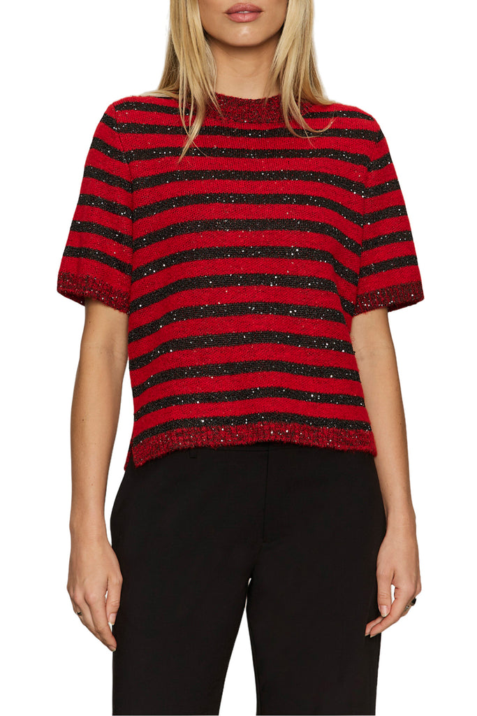 knit tee in cherry red and black stripes with sparkles and sequins throughout. lightweight knit top features a crew neckline, ribbed details, and a relaxed fit. easy to wear top can be styled casually or dressed up for a festive holiday look. pair it with black pants for an easy and chic outfit.