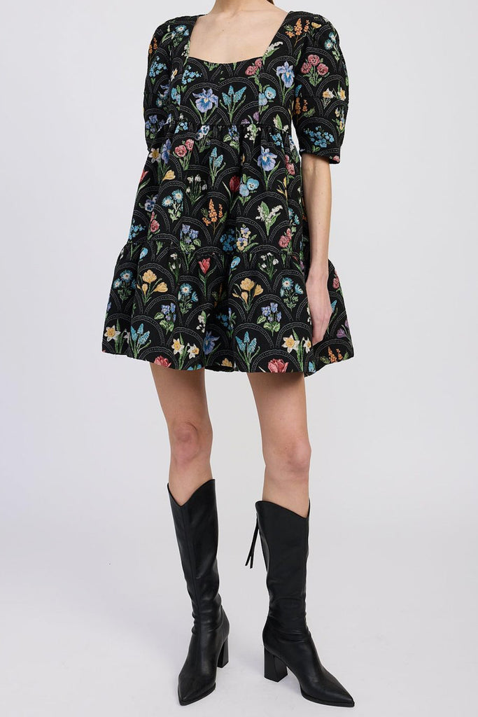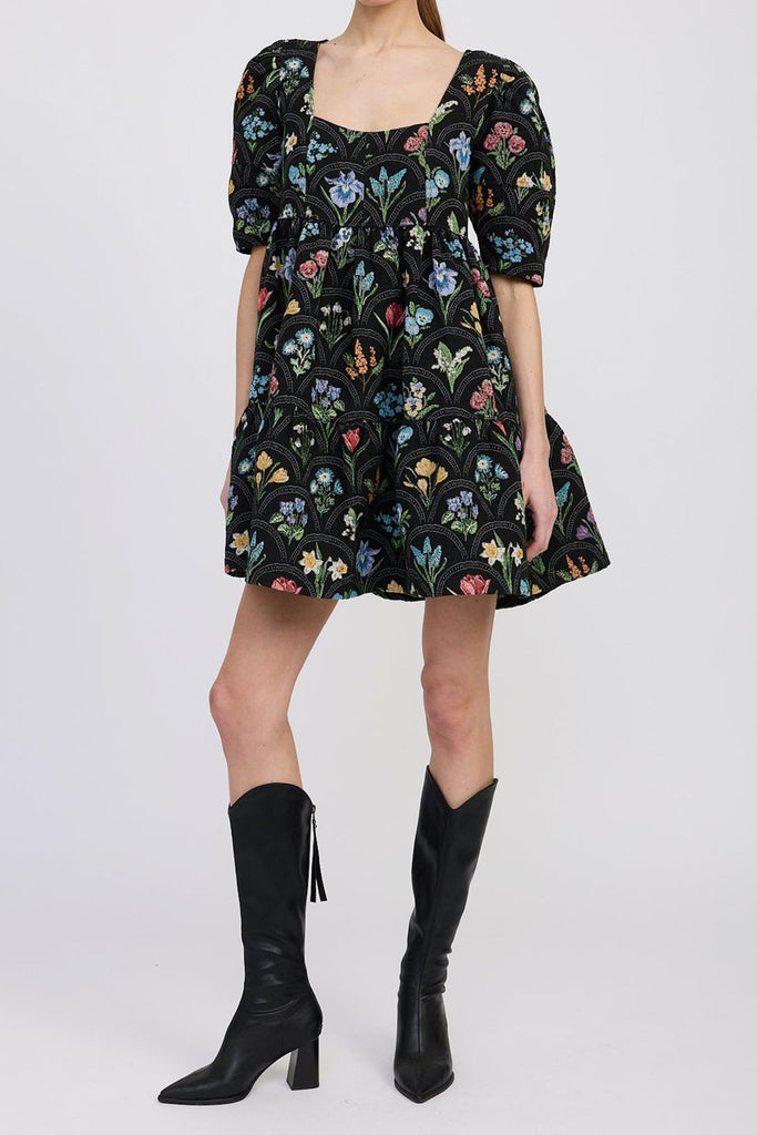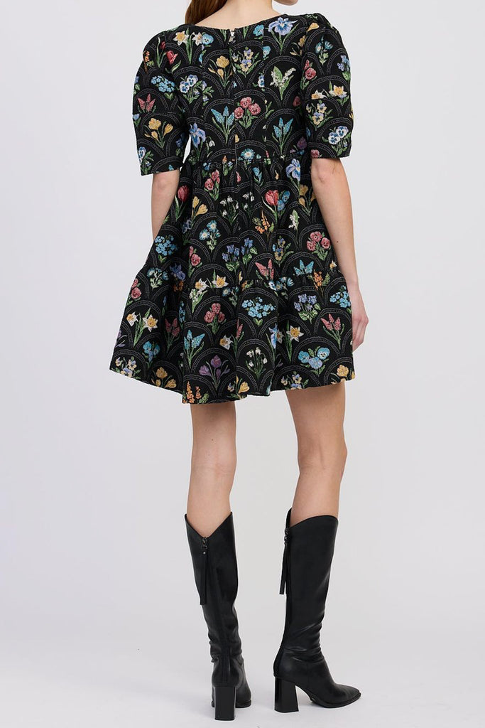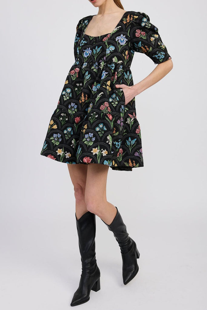 Personify Shopspecial mini dress with a dark floral pattern. dress features a flattering square neckline, short puff sleeves, empire waist, side pockets, and a full ruffled mini skirt. unique dress is perfect for fall and winter special events like weddings, showers, or date nights.