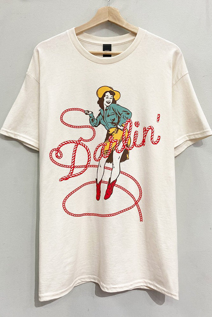 Personify Shopoversized cream colored tee with a vintage/western-inspired graphic. tee design features a cowgirl and her lasso, which creates the message "darlin'." tee features a crew neckline, short sleeves, and a roomy fit. pair with your favorite jeans for a cool casual look.