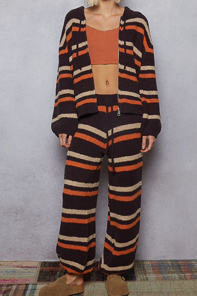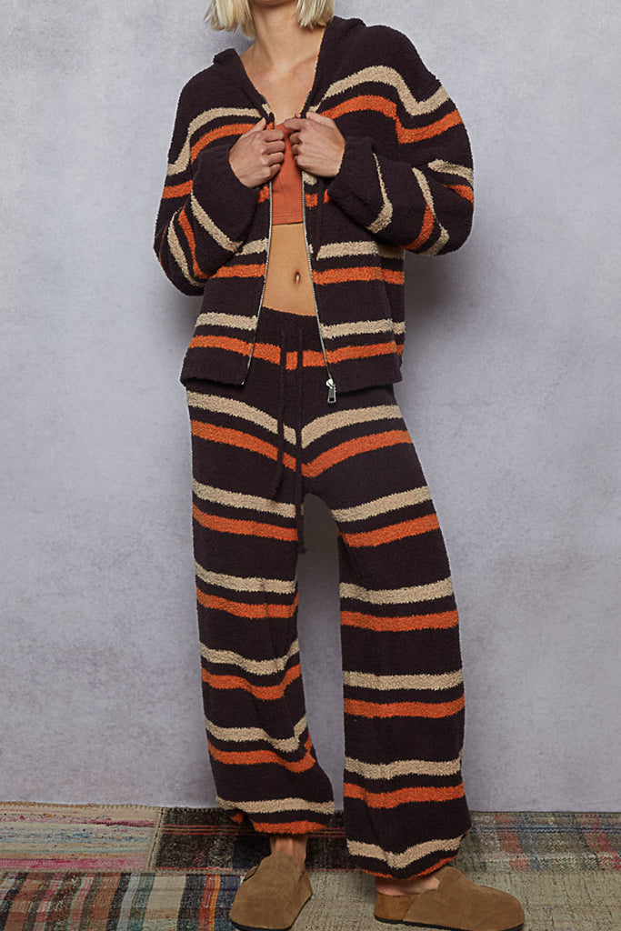 Personify Shopoversized hoodie made from an ultra soft and fuzzy striped chenille in chocolate brown, orange, and khaki. hoodie features a zip front, hood with drawstring, dropped shoulders, and roomy long sleeves. pair with the deep chocolate fuzzy stripe pants for the cute, coordinated look pictured last or wear with your favorite jeans for a cool, casual look.