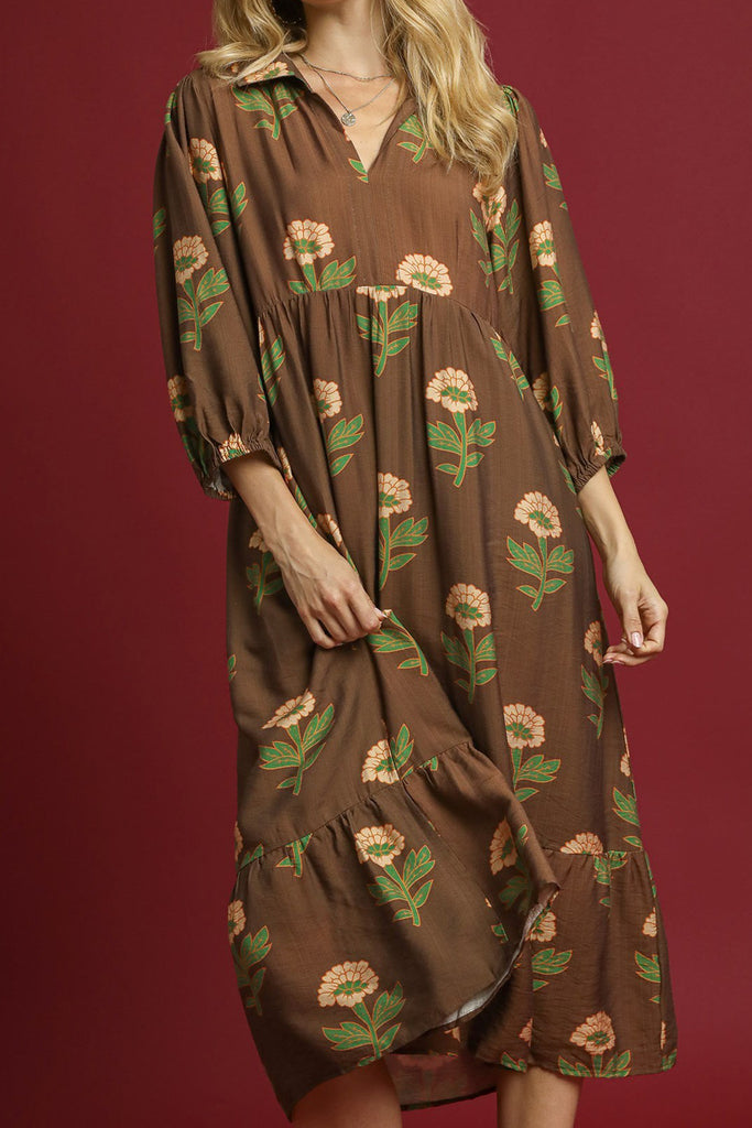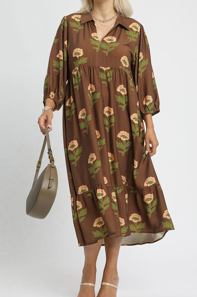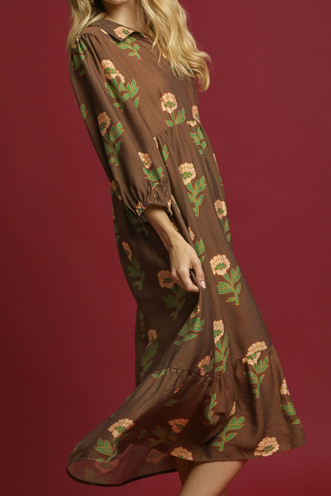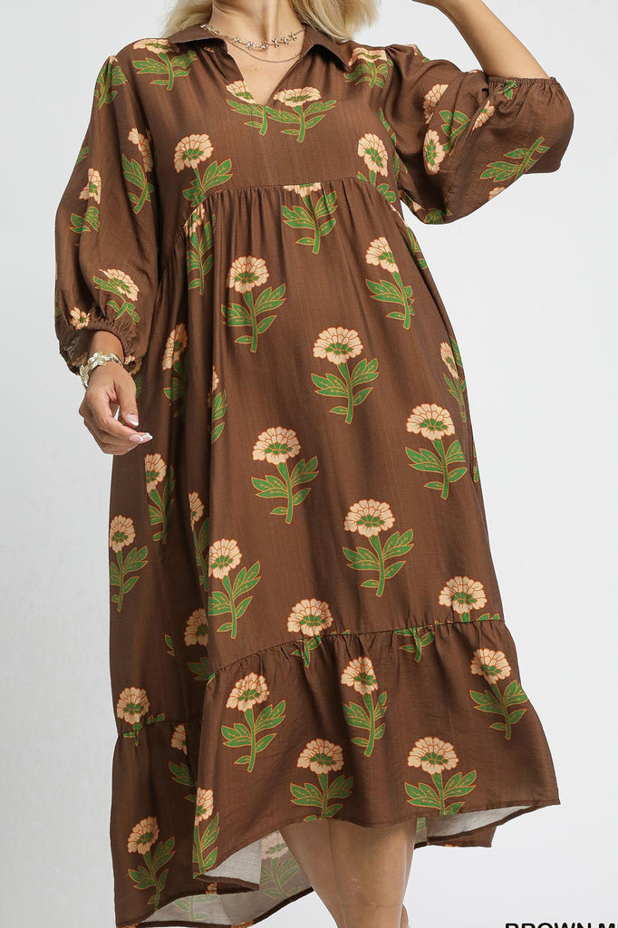 Personify Shopoversized midi dress in trendy chocolate brown with a pretty floral print in cream and green. easy to wear dress features a collared v neckline, a relaxed empire waist, roomy three-quarter length sleeves with elasticated cuffs, and a flowy midi skirt with a ruffled bottom hem. lightweight dress is available in an inclusive size range.