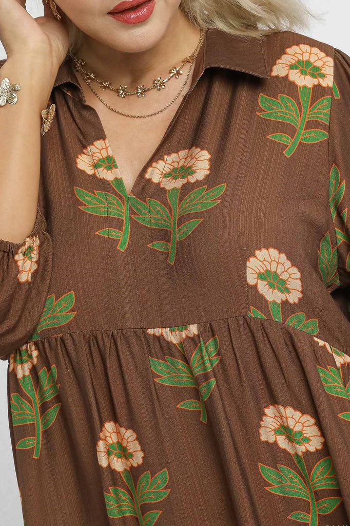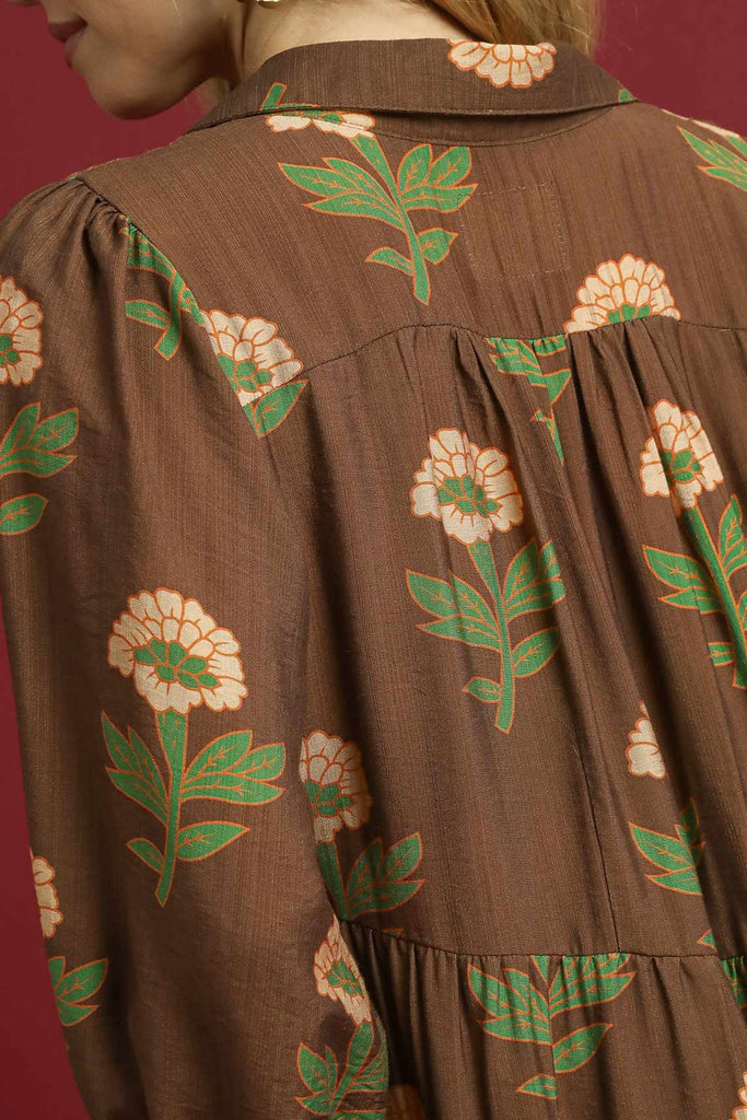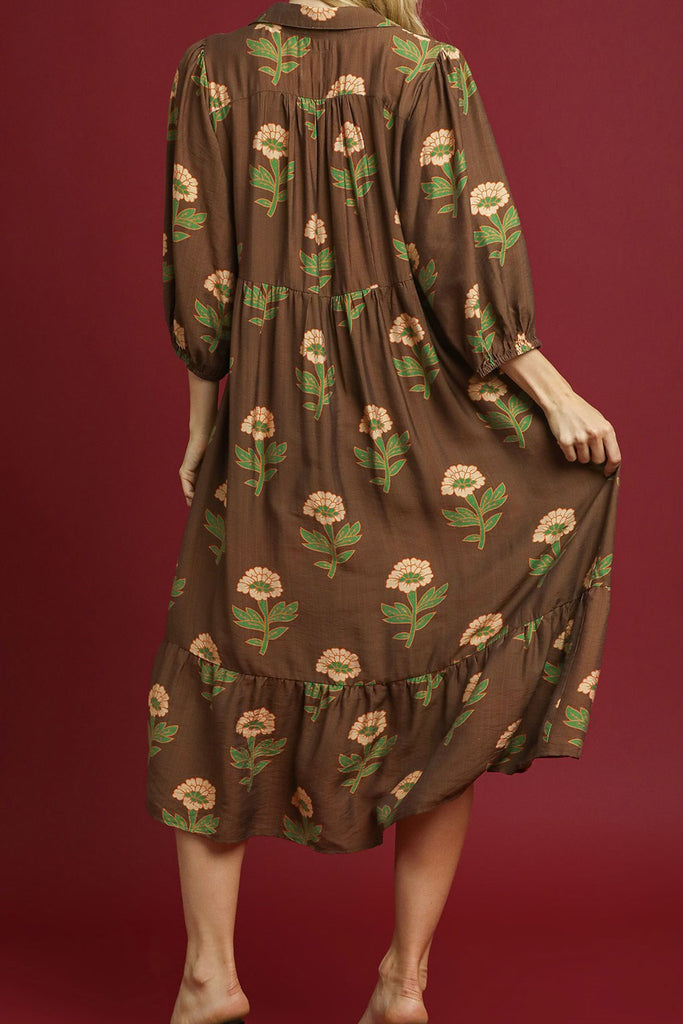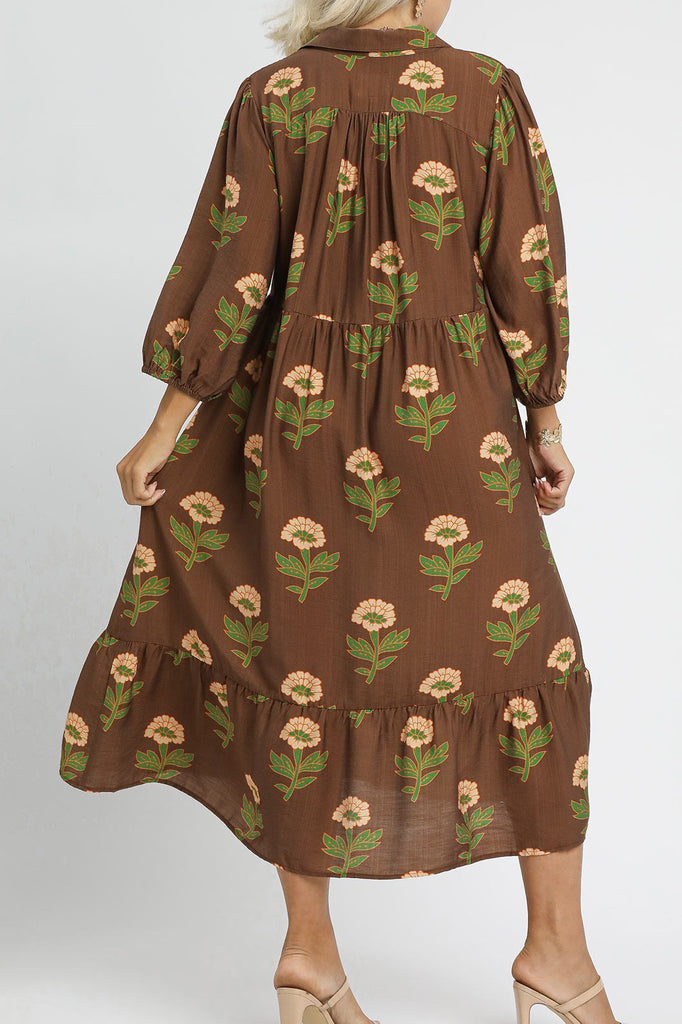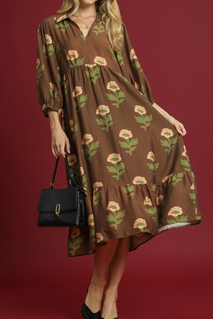Personify Shopoversized midi dress in trendy chocolate brown with a pretty floral print in cream and green. easy to wear dress features a collared v neckline, a relaxed empire waist, roomy three-quarter length sleeves with elasticated cuffs, and a flowy midi skirt with a ruffled bottom hem. lightweight dress is available in an inclusive size range.