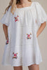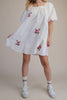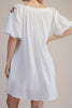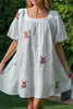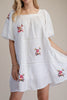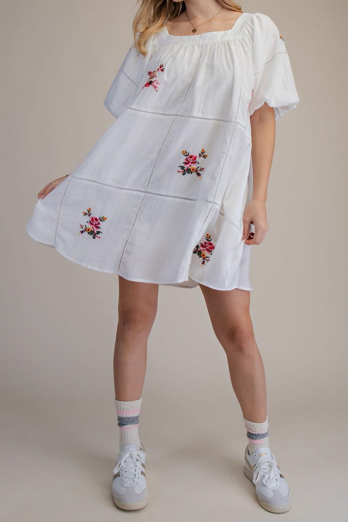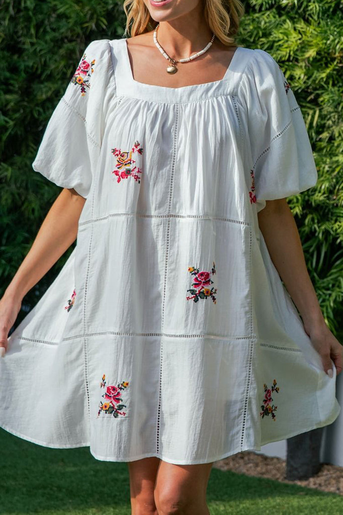 Easellightweight and airy white dress with a vintage-feeling shape and embroidered floral details. lined dress features a square neckline, short balloon sleeves, side pockets, a relaxed fit, and a beautifully constructed front with special lace details and cross-stitch inspired embroidery. easy to wear dress can be dressed up or down all spring and summer long.
