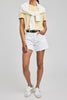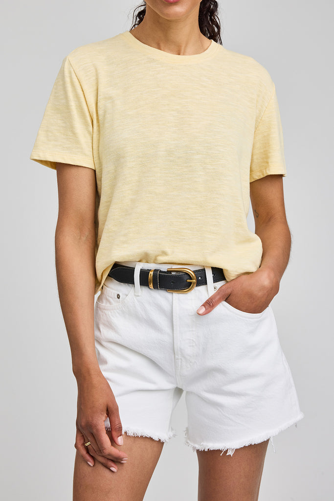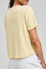 Personify Shoplightweight tee in pale cornsilk yellow. cotton-linen blend tee has a classic silhouette and a soft fabrication. it features a crew neckline, short sleeves, and a relaxed fit. effortless basic is perfect to pair with jeans or shorts all spring and summer long.