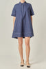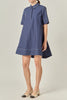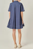 cute shift dress in classic navy blue with white contrast stitching throughout. lined dress features a covered half button front, petite collar, side pockets, pleated detail on back, and a slightly longer back hem, giving dress its swingy fit. soft and comfortable dress is generously sized and makes an easy to wear dress for the fall.
