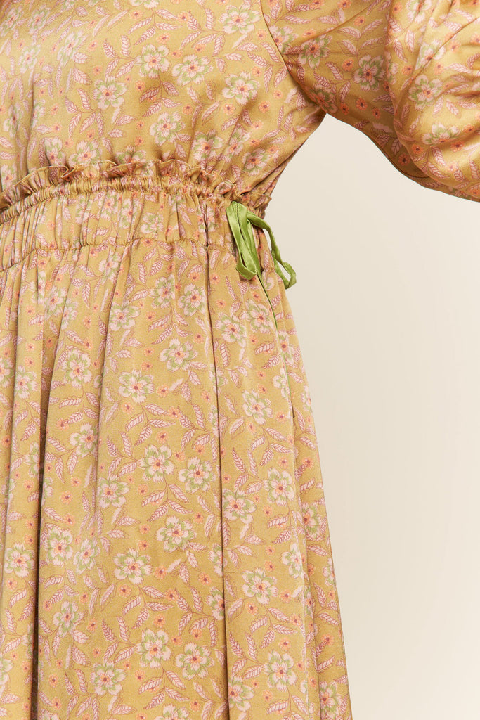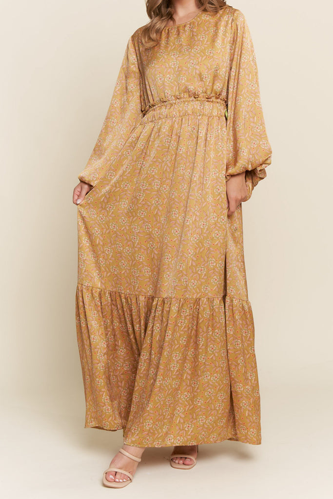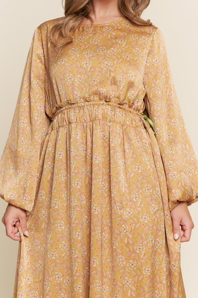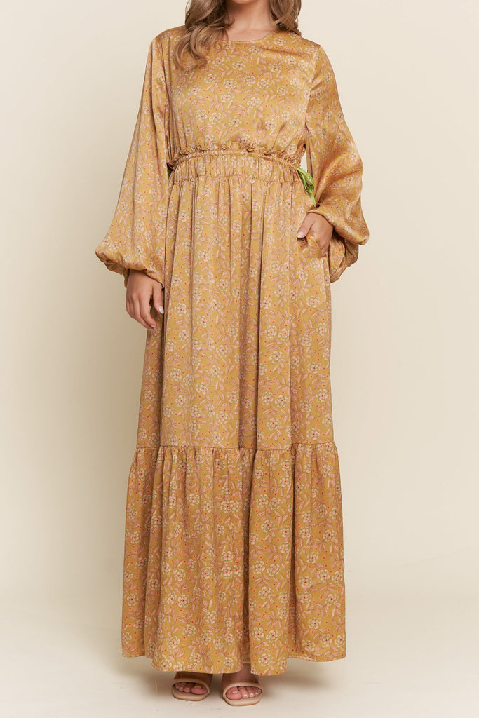 Personify Shopstriking maxi dress in a golden-hued floral pattern. dress is made from a silky material and features a crew neckline with keyhole button closure on back, long balloon sleeves with elasticated cuffs, a gathered waist with adjustable bright green tie, side pockets, and a flowy maxi skirt with a wide ruffled bottom hem. dress is an easy to wear option for special events like fall weddings or family pictures.