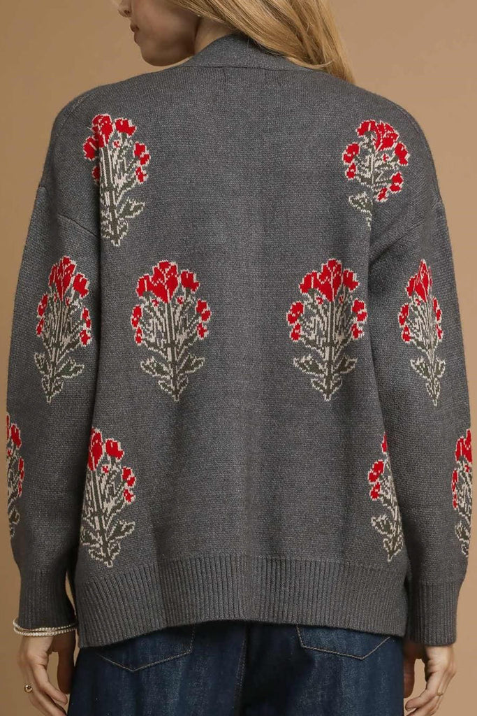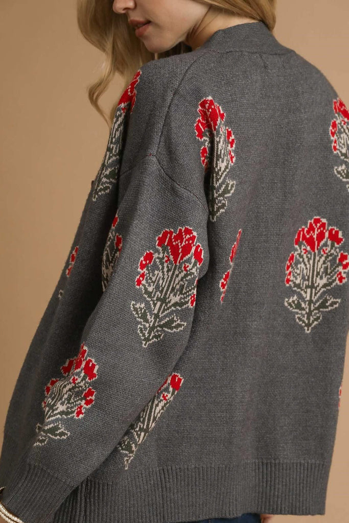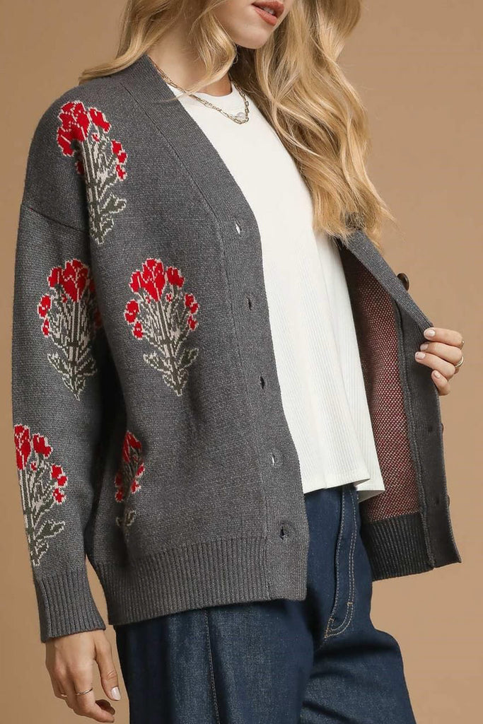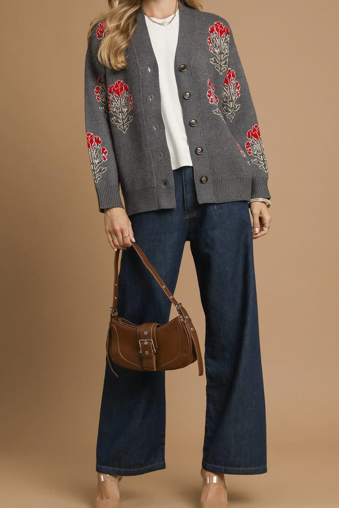 Personify Shoppretty cardigan in charcoal grey with lovely floral details in bold red and dark green. sweater is soft and can be worn on its own against the skin. it features a v neckline, brown button front, dropped shoulders, roomy long sleeves, and a relaxed fit. sweater makes a great top or layer to wear over a tee or dress into the fall and winter.