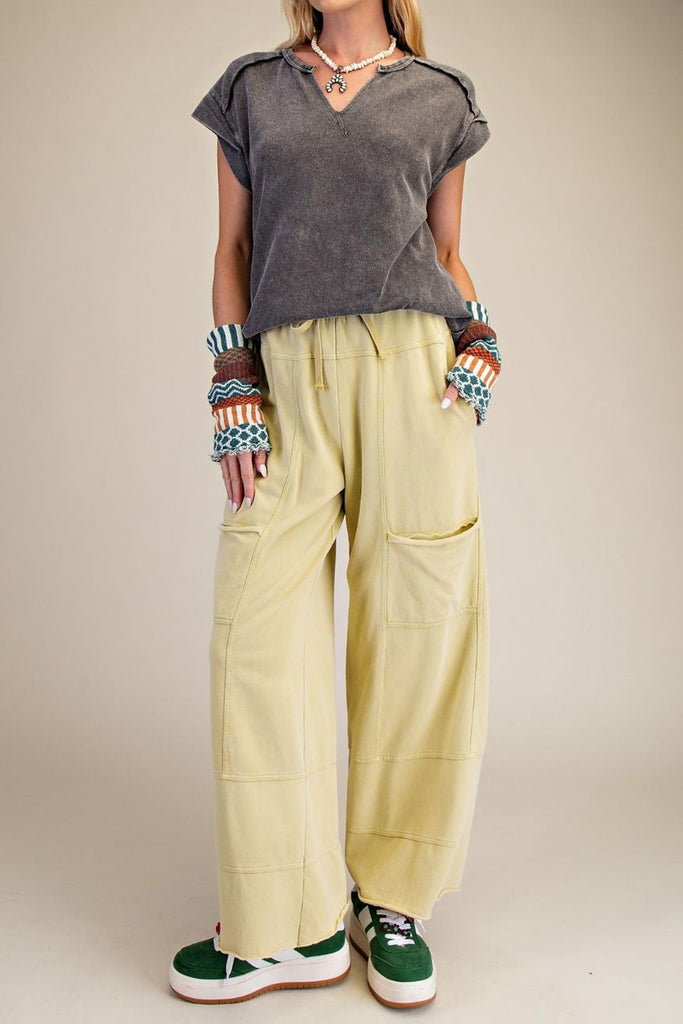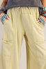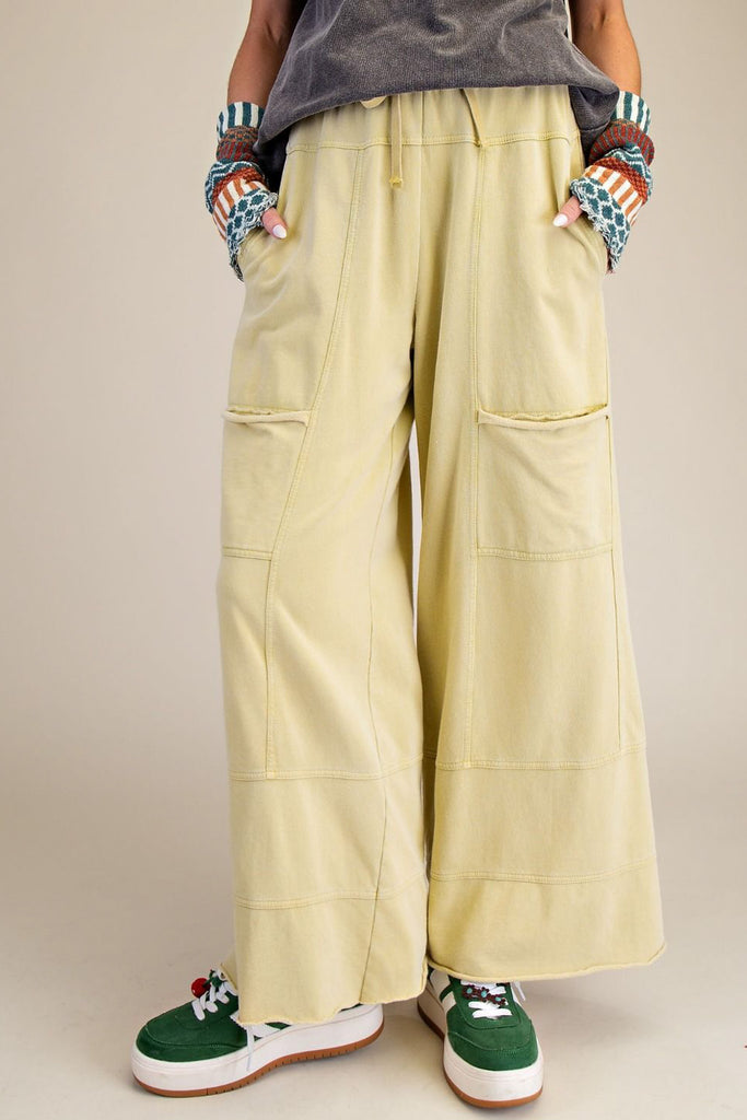 comfortable pull-on pants in a light washed yellow. cotton pants feature high rise elastic waistband with drawstring, side and back pockets, unique front pockets, exposed seam details, rolled hems, and a swingy, wide leg silhouette. elevated sweatpants make great loungewear or can be worn out and about with your favorite top or graphic tee.