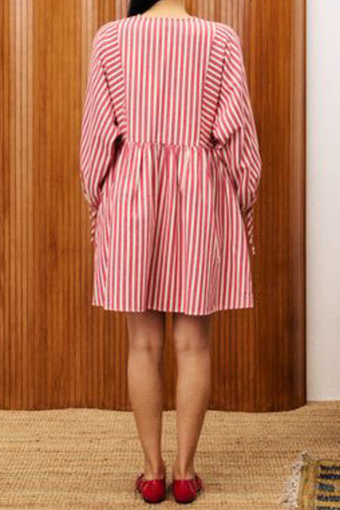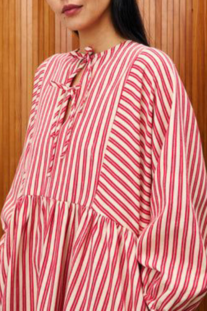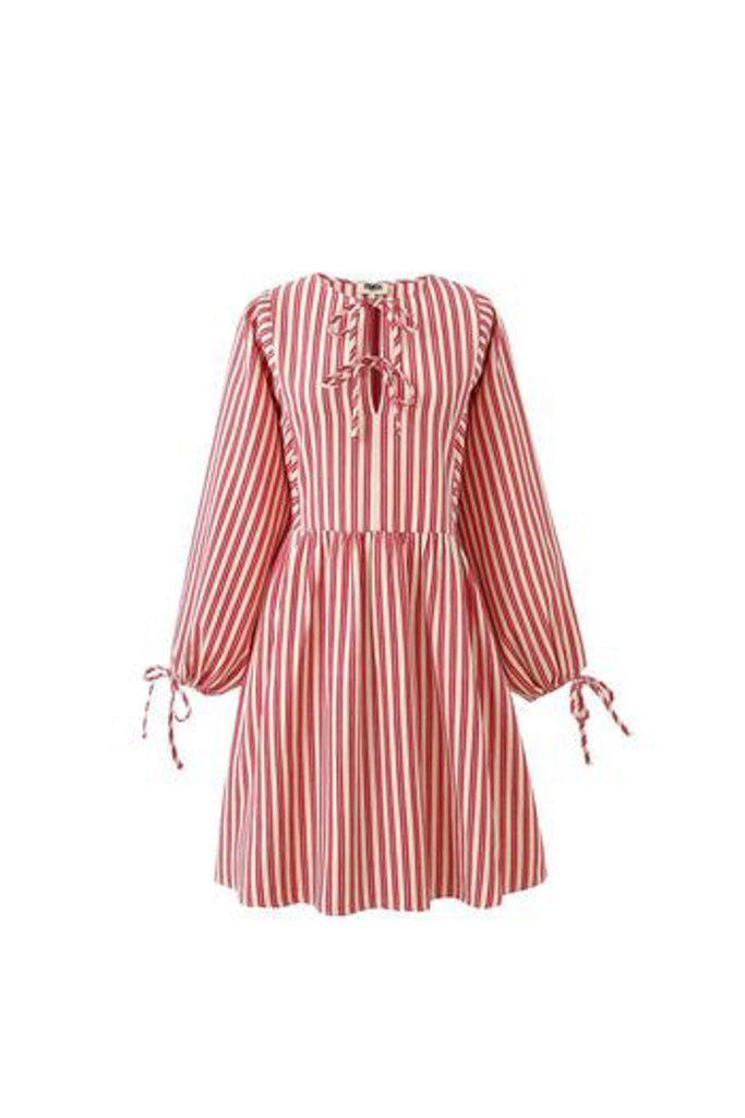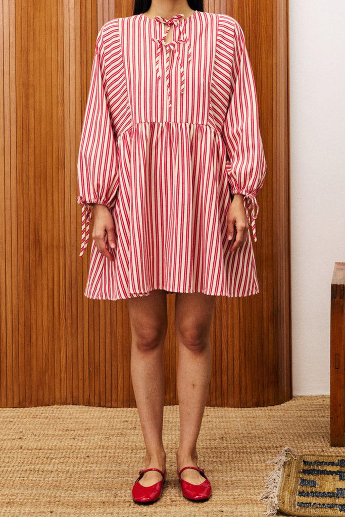 Personify Shopspecial mini dress in red and white stripes. loose-fitting dress features a round neckline, on-trend front ties, gathered waist, and roomy balloon sleeves with wrist ties. dress makes a sweet piece to bring into the fall or even the holiday season.